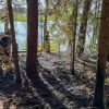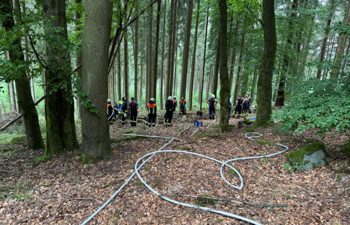 Vor Ort konnten schließlich offene Flammen im Waldbereich direkt neben dem Badeweiher festgestellt werden, die dringend bekämpft werden mussten. Da sich die Brandstelle fernab jeglicher befahrbarer Wege befand, mussten Handwerkzeuge, Feuerlöscher und Kleinlöschgeräte über die gesamte Strecke zur Einsatzstelle getragen werden.