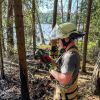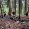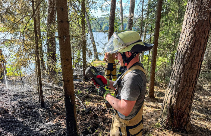 Mit Hilfe der kleinen TS (Tragkraftspritze) konnte Wasser direkt aus dem Weiher entnommen und auf die Brandstelle abgegeben werden. So gelang es, das Feuer vollständig abzulöschen und den Bereich ausreichend zu bewässern. Zudem wurde der Waldboden in schweißtreibender Arbeit mit Handwerkzeugen geöffnet, um letzte mit einer Wärmebildkamera aufgespürte Glutnester ablöschen zu können.