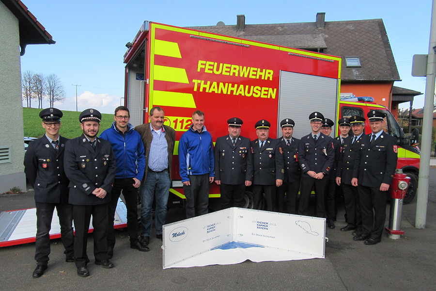 Im Rahmen der Neubeschaffung eines TSF-Logistik wurden die Verantwortlichen der Feuerwehr auf diese Staustelle aufmerksam. Die Versicherungskammer Bayern, vertreten durch Herrn Florian Ramsl, war zufällig noch auf der Suche nach einer Feuerwehr, die die Staustelle „Biber“ auf Herz und Nieren testet. So gelang es, dass die zweite in ganz Bayern durch die Versicherungskammer Bayern gesponserte Staustelle „Biber“ an die Feuerwehr nach Thanhausen ging. Diese erstmals in den Farben der Versicherungskammer Bayern weiß und blau. Sollte sich das Einsatzmittel bewähren, will die Versicherungskammer bayernweit für den „Biber“ ein Förderprogramm auflegen. Die genauen Details dazu sind derzeit aber noch nicht spruchreif. Die Versicherungskammer Bayern ist ein starker und verlässlicher Partner bei der Förderung von Feuerwehren.
