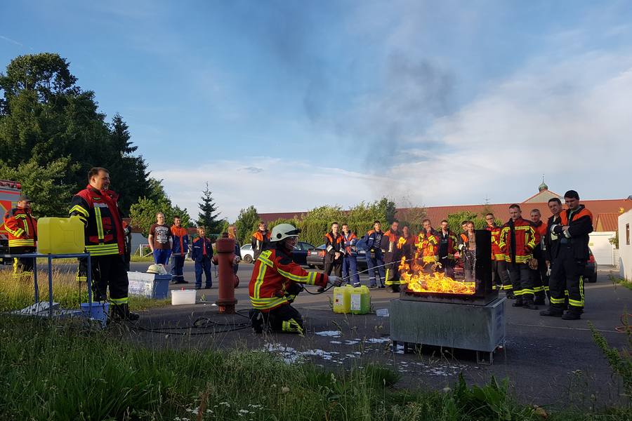 Im Anschluss an den breitgefächerten Unterricht nahmen die rund dreißig teilnehmenden Kemnather Floriansjünger einige Löschübungsversuche mit dem Schaumtrainier des Kreisfeuerwehrverbandes Tirschenreuth auf den Übungshof vor. Hierbei wurden die besprochenen Grundsätze, sowie die direkten Aufbringung mit Netzmittel, Schwer- und Druckluftschaum, der indirekten Applikation durch Abregnen über dem Brand oder das Aufschieben auf das Brandgut, sowie dem Abprallen des Löschschaum an einer Wand. Zudem ist eine "schützende Beschäumung" zum vorübergehenden Schutz und einer Gefahrenabwehr, etwa bei einem auslaufenden Tanklastzug.