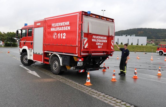 Und das lernt man nicht in der normalen Fahrschule. Dafür gibt es Fahrsicherheitstrainings, so wie vor kurzem in Himmelkron am Parkplatz des Fichtelgebirgshof. 18 Kameraden der Feuerwehren Bärnau, Kondrau, Speinshart, Tirschenreuth, Waldsassen, Waldthurn und Windischeschenbach bekamen hier die Möglichkeit unter den wachsamen Augen des Ausbilders Matthias Zeilmann der Fahrschule Zeilman AVUS aus Ahorntal ihr Können unter Beweis zu stellen und ihre Fahrpraxis zu verbessern. Alles auf abgesperrter Fläche. Möglich machte dieses Training der Landesfeuerwehrverband Bayern in Kooperation mit der Kommunalen Unfallversicherung Bayern (KUVB). Die Gefahrenbremsungen, das Rangieren in beengtem Raum oder eine schnelle Kehrtwende auf begrenzter Fläche war der eine Teil der praktischen Ausbildung. Aber auch der Beifahrer wurde dabei gefordert, denn er musste den Fahrer einweisen. Und um diese Übungen zu erschweren, gleich das ganze nochmal ohne die Seitenspiegel, ohne Rückfahrkamera. Nur durch die Augen des Beifahrers und seine Kommandos.