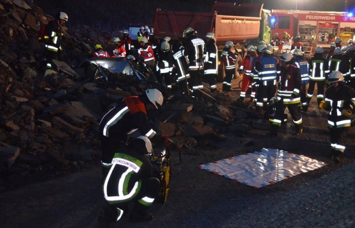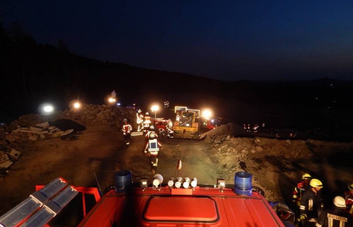 Einbrechende Dunkelheit erschwerte den Floriansjüngern die Rettungsarbeiten. Nebst der Befreiung der in dem Fahrzeug eingeklemmten „Personen“ und dem im Beinbereich verschütteten Lasterfahrer galt es auch, ein weiteres abrutschen des Radladers zu vermeiden. Hierzu wurde der Radlader durch die mechanischen Winden der Hilfeleistungslöschfahrzeuge aus Immenreuth und Kemnath gesichert. Mehrere Lichtmasten wurden aufgebaut und eine Brandabsicherung erstellt. Schweißtreibend gestaltete sich die Freilegung des Autos, bei welchem die Einsatzkräfte per Hand die einzelnen Gesteinsbrocken beiseite räumen mussten.
