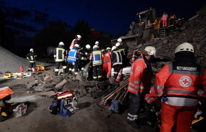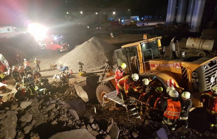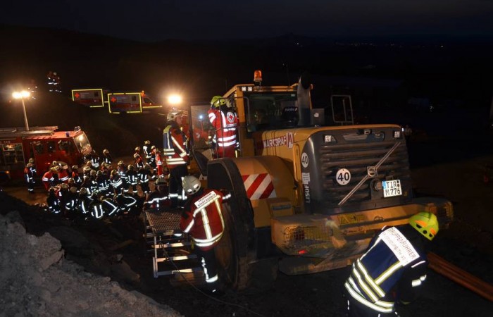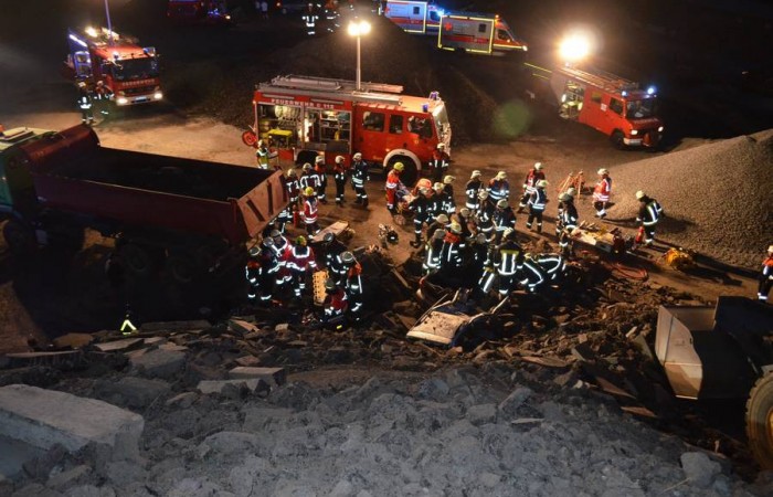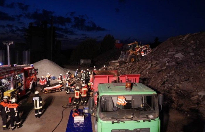 Bei Arbeiten im Asphaltmischwerk kommt es zu einem schweren Unfall. Drei Menschen werden unter Trümmern eingeklemmt. Als die Rettungskräfte den Verunglückten helfen, passiert ein weiteres Unglück. 124 Rettungskräfte übten den Ernstfall.