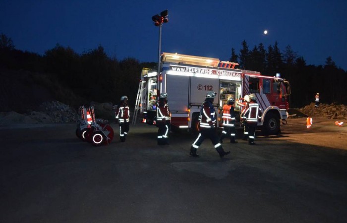 Als am späten Abend die Sirenen im Kemnather Land und dem Fichtelnaabtal heulen, erreicht die Floriansjünger der Region die Meldung, dass auf dem Betriebsgelände des Asphaltmischwerks nach einem Unfall Personen eingeklemmt seien. Entsprechend der Notfallmeldung hatte die Integrierte Leitstelle Nordoberpfalz die Feuerwehreinsatzkräfte aus Zinst, Oberwappenöst, Kulmain, Kemnath, Lochau, Neusorg und Riglasreuth mit unterschiedlichsten Gerätschaften und Fahrzeugen alarmiert.