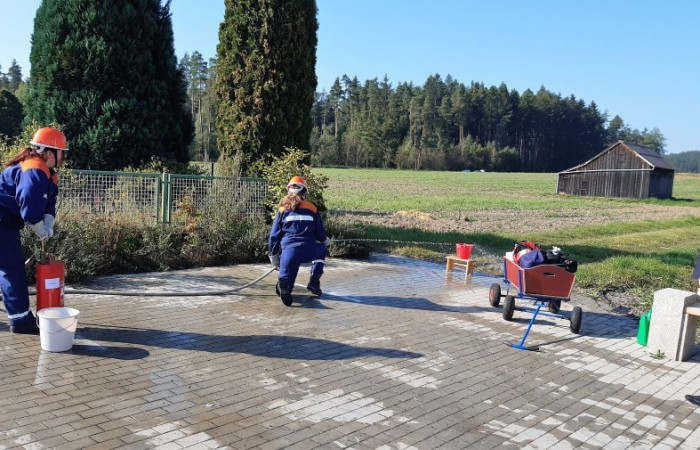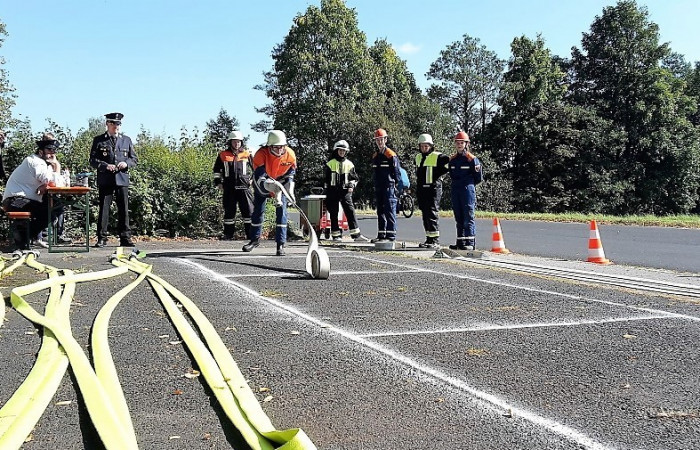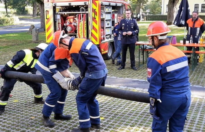 Bei der Prüfung wurde besonders auf die Arbeit im Trupp bzw. in der Gruppe geachtet. Bei Stationen wie dem Zielspritzen mit der Kübelspritze oder dem Zusammenkuppeln einer 90-Meter-Schlauchstrecke konnten die Jugendlichen dies unter Beweis stellen. Aber auch die Leistung des Einzelnen wurde bei Übungen wie dem Brustbund, dem Ausrollen eines C-Schlauches oder dem Anlegen eines Mastwurfes gefordert. Insgesamt mussten so fünf Trupp-, fünf Einzelübungen und eine Theorieprüfung absolviert werden. Kreisjugendwart Wolfgang Bauer konnte allen Jugendlichen zur bestandenen Jugendleistungsprüfung gratulieren und bedankte sich bei den Jugendwarten und Helfern für die Ausbildung.