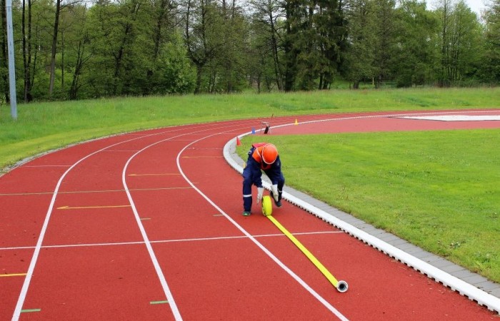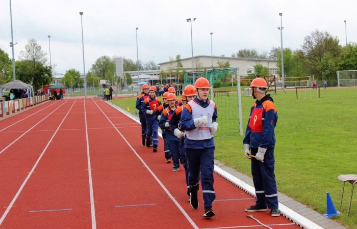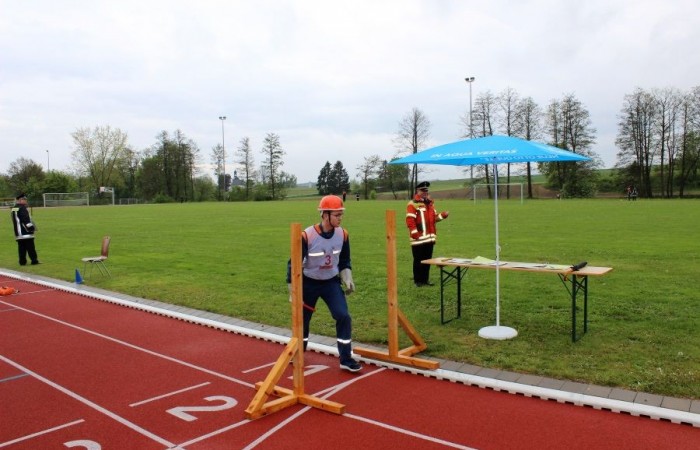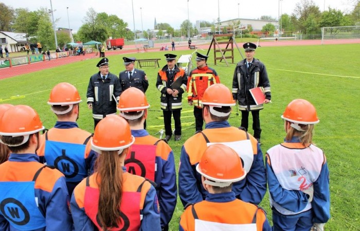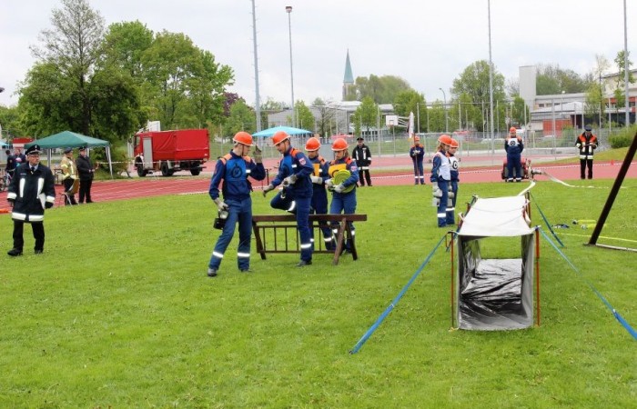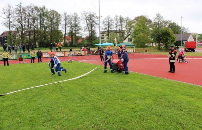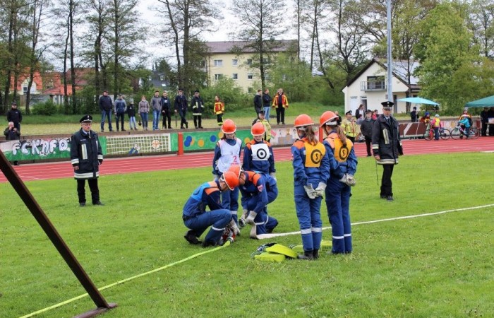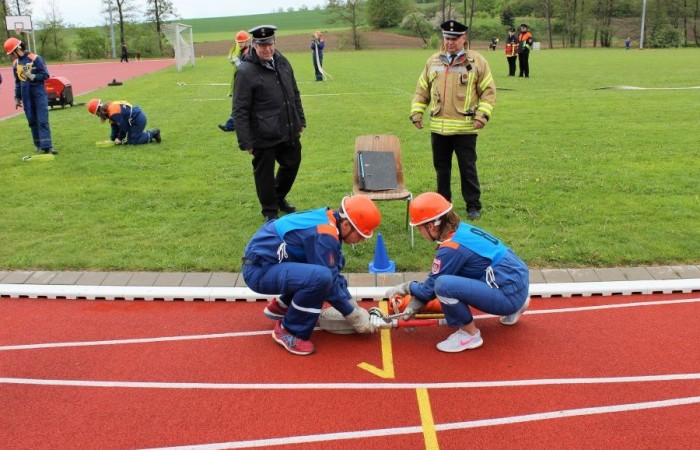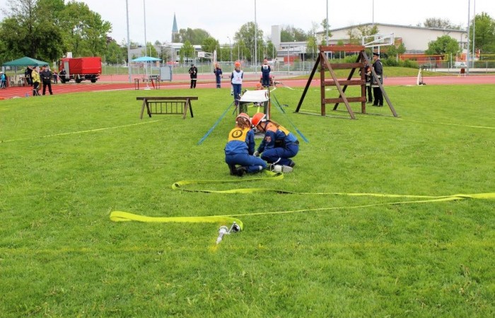 So galt es, einen 15 Meter langen C-Druckschlauch auf der Tartan-Bahn zusammenzurollen, ein Laufbrett zu überlaufen, Schutzausrüstung nach dem Aufstehen von einer Krankentrage anzulegen, sowie ein Strahlrohr an einen Schlauch anzukuppeln und einen „Mastwurf mit Halbschlag“ daran anzulegen. Auch hier wurde durch die Wertungs- und Schiedsrichter den Jugendfeuerwehranwärterinnen und -anwärtern genauestens „auf die Finger geschaut“, die möglichen Fehler dokumentiert, die Zeit gestoppt und entsprechend in die Gesamtwertung eingerechnet.