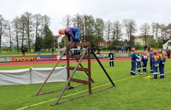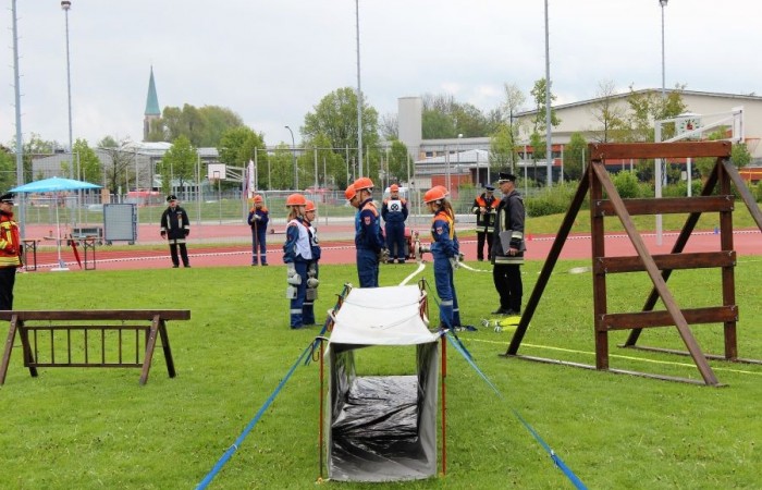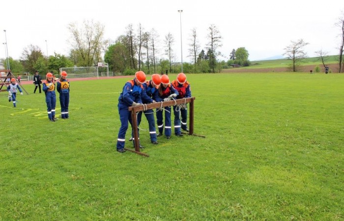 Den eifrigen Feuerwehrnachwuchs stoppte auch das nasskalte Wetter nicht. Beim sogenannten „A-Teil“, dem Löschaufbau, kuppelten die Jugendgruppen in beträchtlicher Geschwindigkeit die Saugleitung, verlegten die B-Schlauchleitung zum Verteiler durch den Kriechtunnel, überwandten den „Wassergraben“, kletterten über die Leiterwand und sprangen über die Hürde, währenddessen die drei Trupps die C-Schläuche vornahmen und den Löschangriff mit Strahlrohren andeuteten. Innerhalb der Zeitmessung beim Löschaufbau galt es auch vier feuerwehrtechnische Knoten und Stiche an einem Gestell anzulegen.