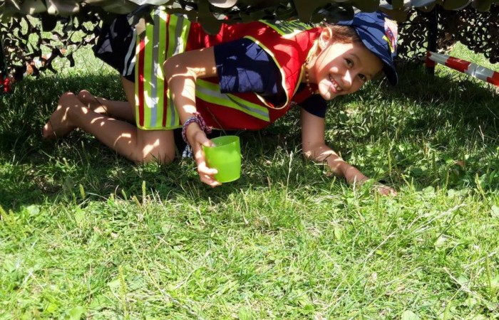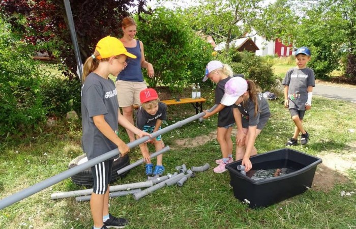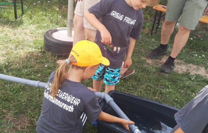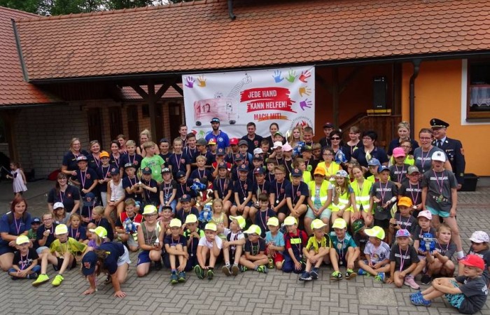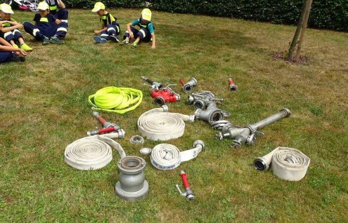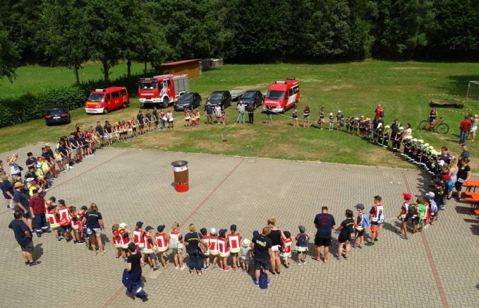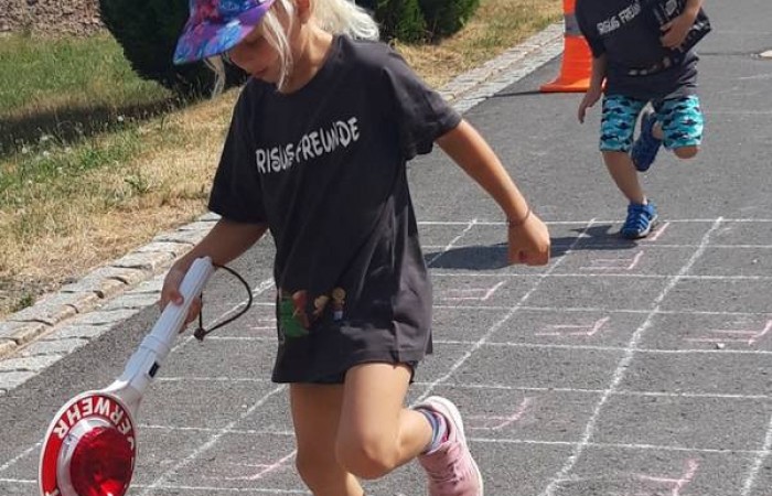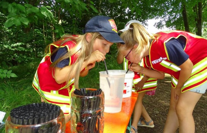 Die Gruppen gingen an ihre Start-Stationen und begannen nach dem Startschuss (bei uns natürlich dem Start-Martinshorn). Wie bei der aktiven Wehr stand auch bei den 14 Stationen der Teamgeist im Vordergrund. Gemeinsam musste z.B. Wasser mittels eines Strohhalms transportiert, eine Rohrleitung gebaut oder Wasser durch einen Hindernisparcours getragen werden. Bei der Station "Atemschutz" war der Tastsinn gefragt, an anderer Stelle musste ein Notruf abgesetzt oder die stabile Seitenlage geübt werden. Bei der Station "Was brennt wie" wurde die Explosion einer leeren Sprühdose gezeigt, bei "Hochwasser-Einsatz" mussten Sandsäcke zielgenau geworfen werden.