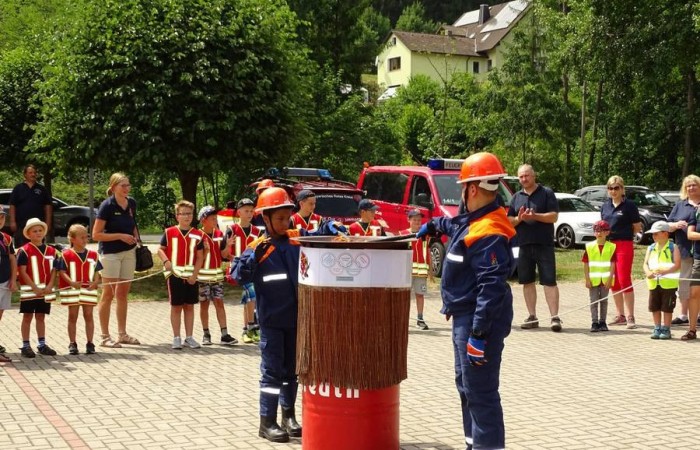 Bei der Feuerwehr sind alle gleich wichtig und arbeiten zusammen, egal ob Kinderfeuerwehrler, Kommandant oder Kreisbrandinspektor. Dies wurde dadurch symbolisiert, dass man sich im Kreis aufstellte und an einer Leine festhielt. Mitten im Kreis stand, wie es sich für eine Olympiade gehört, das olympische Feuer. Dieses entzündeten Tyrek und Nils, zwei ehemalige Feuerdrachen.
