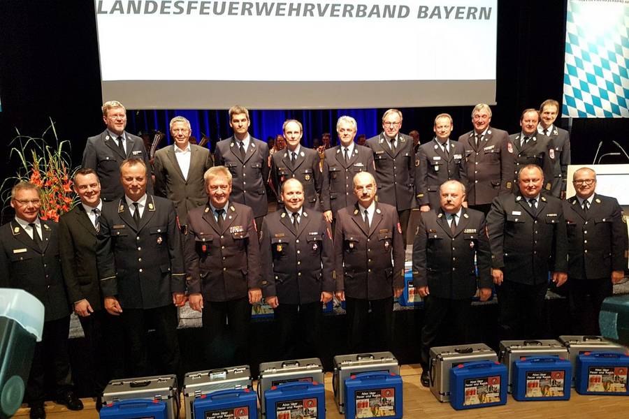 Bei der Vollversammlung des Landesfeuerwehrverbandes Bayern e.V. am 15. Sept. 2017 in Altötting erhielt Kreisbrandrat Andreas Wührl zusammen mit weiteren Kreis- und Stadtbrandräten den neuen Brandschutzerziehungskoffer und die Notruf-Übungsanlage überreicht. Diese Brandschutzerziehungskoffer werden im Zeitraum von 2016 - 2018 von der Bayerischen Versicherungskammer allen 96 Kreis- und Stadtverbänden kostenlos zur Verfügung gestellt. Bis Ende des Jahres werden bereits 68 dieser Koffer in ganz Bayern verfügbar sein. Zusammen mit Staatsminister Dr. Marcel Huber überreichten die Vertreter der Bayerischen Versicherungskammer den 14 Kreis- und Stadtbrandräten aus allen Regierungsbezirken die Koffer und die Notruf-Übungsanlagen. Aus der Oberpfalz erhielt neben dem Kreisfeuerwehrverband Tirschenreuth auch der Kreisfeuerwehrverband Regensburg diese Ausstattung. Der Koffer enthält ein Notruf-Set, eine Medienmappe und Übungsmaterial für Lehrer. Ein umfangreicher Ordner, mehrere DVDs und ein USB-Stick "Elternabend" runden das umfangreiche Paket ab. Ansprechpartner beim Kreisfeuerwehrverband Tirschenreuth für die Brandschutzerziehung und Brandschutzaufklärung ist Kreisbrandmeister Albert Fröhlich.