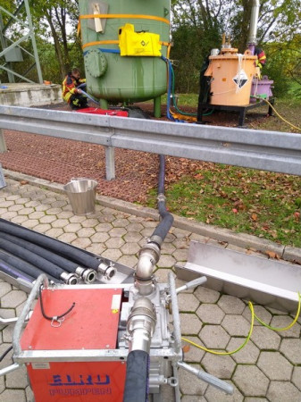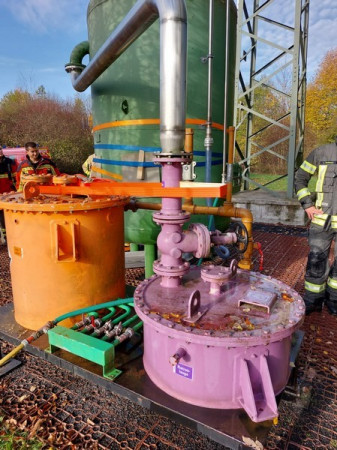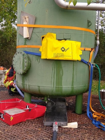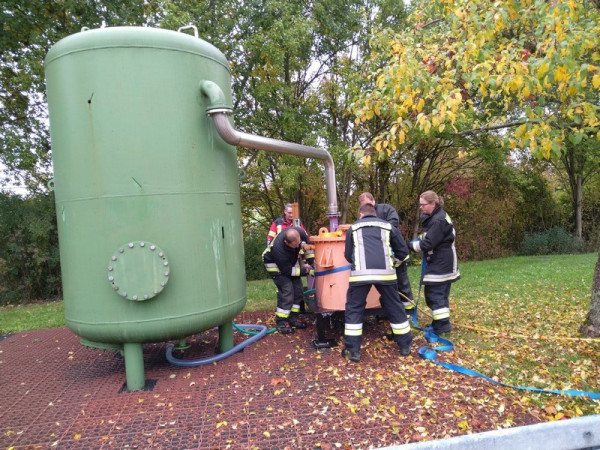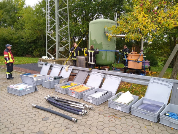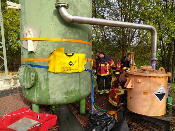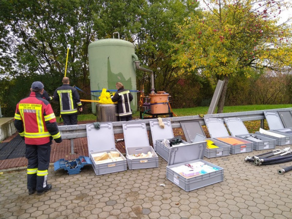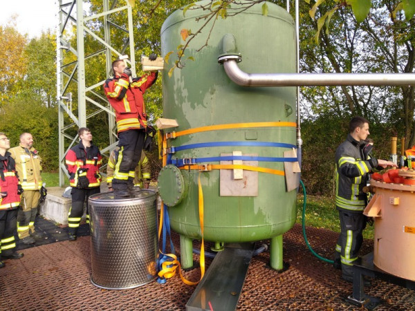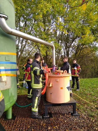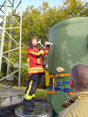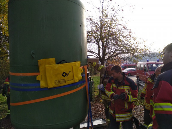 Am zweiten Lehrgangstag konnten die Gerätschaften an der Gefahrgut-Übungsanlage der Feuerwehr Arzberg bei der Bekämpfung von Gefahrgut-Leckagen angewandt werden. Dabei musste auslaufendes Gefahrgut, simuliert mit Wasser, aufgefangen und Lecks abgedichtet werden. Das aufgefangene Medium wurde anschließend mit der Gefahrgutumfüllpumpe umgepumpt.