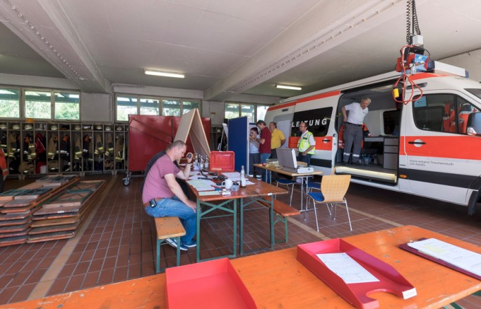 Aufgrund des angenommenen Schadensereignisses wurde nach dem Bayerischen Katstrophenschutzgesetz (BayKSG) eine örtliche Einsatzleitung (ÖEL) mit Kreisbrandrat Andreas Wührl als vorab benannter ÖEL gebildet. Gleichzeitig wurde im Landratsamt Tirschenreuth die Führungsgruppe Katstrophenschutz (FüGK) unter der Leitung von Frau Oberregierungsrätin Regina Kestel einberufen. Im Feuerwehrgerätehaus Tirschenreuth trat neben dem ÖEL auch ein Stab mit den besonderen Führungsdienstgraden, Fachberatern von THW und Polizei und die Einsatzleitung Sanitätsdienst mit dem leitenden Notarzt Dr. Andreas Dauber zusammen. Unterstützt wurden sie dabei von den Unterstützungsgruppen örtliche Einsatzleitung und Sanitätseinsatzleitung.