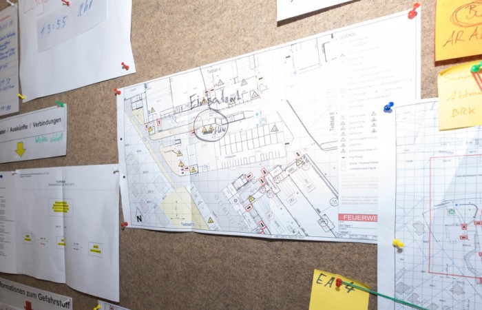 Von der Regierung der Oberpfalz waren die Herren Michael Iberer und Thomas Bahlcke anwesend. Fachbereichsleiter Hans-Christian Eibl und sein Team von der SFS Geretsried hatten ein Szenario ausgearbeitet, bei dem ein Kran auf einen mit Ammoniakwasser beladenen Tanklastzug stürzte.
