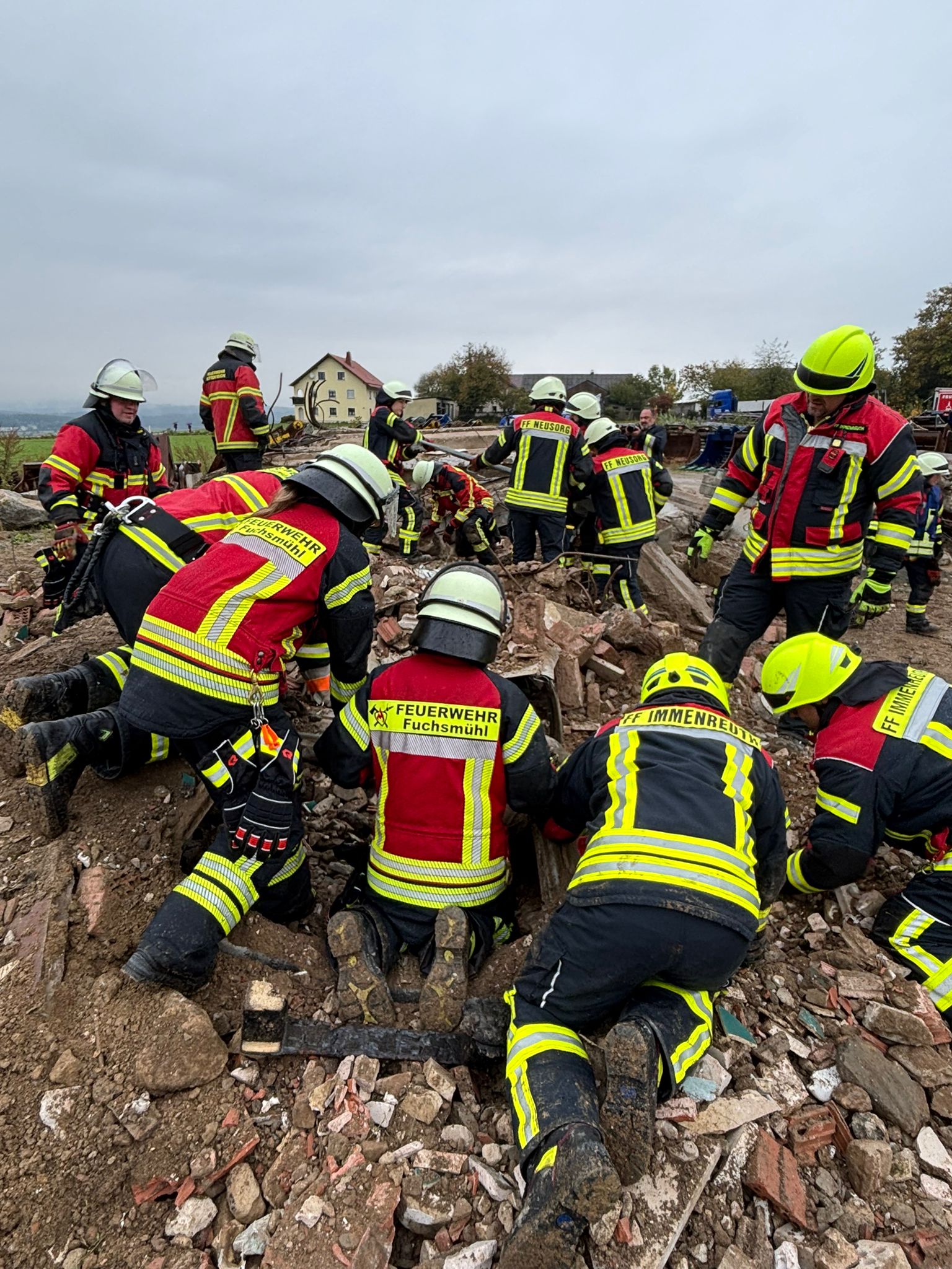 Am zweiten Übungstag lag der Schwerpunkt auf der Rettung verschütteter Personen – eine Herausforderung, wie sie nach einem Erdbeben häufig auftritt. Hierfür stellte die Firma Plannerer ein speziell präpariertes Übungsgelände sowie schwere Bagger zur Verfügung. Dieses realitätsnahe Szenario ermöglichte es den Einsatzkräften, das Zusammenspiel von Feuerwehr, BRK und technischen Hilfsmitteln intensiv zu trainieren. Die professionelle Unterstützung und Bereitstellung der Maschinen durch die Firma Plannerer trug maßgeblich zum Erfolg der Übung bei.