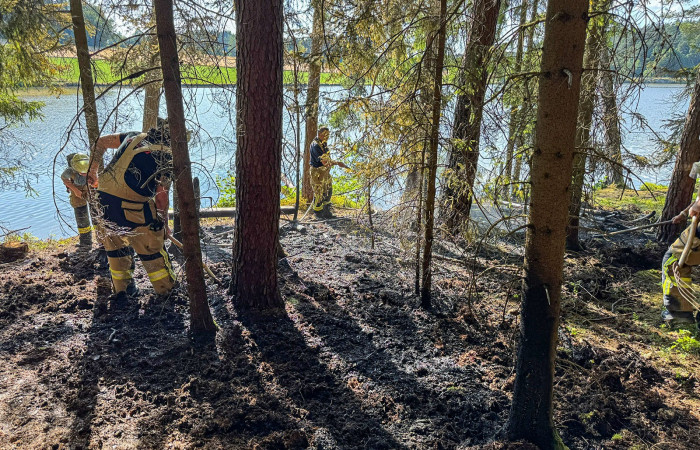 Vor Ort konnten schließlich offene Flammen im Waldbereich direkt neben dem Badeweiher festgestellt werden, die dringend bekämpft werden mussten. Da sich die Brandstelle fernab jeglicher befahrbarer Wege befand, mussten Handwerkzeuge, Feuerlöscher und Kleinlöschgeräte über die gesamte Strecke zur Einsatzstelle getragen werden.