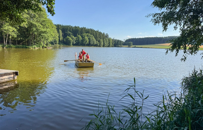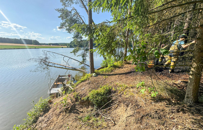 Kommandant und Einsatzleiter Matthias Haulena entschied sich zudem für eine kreative und effektive Methode, um Löschwasser zur Brandbekämpfung einzusetzen: Er ließ das Boot der Freiwilligen Feuerwehr Tirschenreuth nachalarmieren. Dieses wurde kurzerhand am Ufer der Liegewiese mit einer kleinen, motorbetriebenen Tragkraftspritze sowie Schlauchmaterial beladen und nach Überquerung des Weihers als „Löschboot“ eingesetzt.