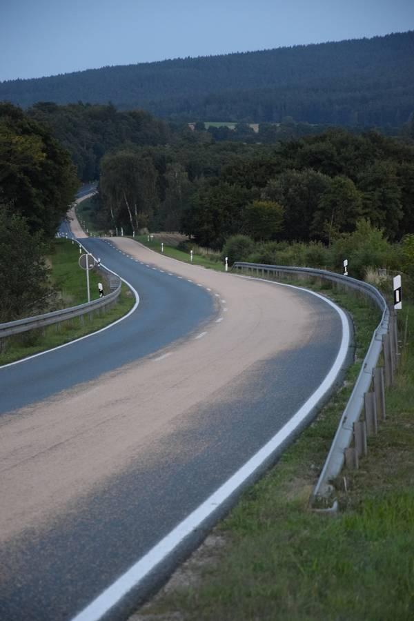 Zwar war die Getreideschicht auf der Bundesstraße im Einmündungsbereich zur Kreisstraße nach Zwergau am dichtesten, zog sich die annähernd fünf Meter breite Getreidespur bis zur ersten Einfahrt der Ortschaft Guttenberg aus Richtung Waldeck kommend und endete in einer Bushaltestelle. Dort hatte der Fahrer des Gespannes wohl bemerkt, dass er massiv Ladung verloren hatte.
