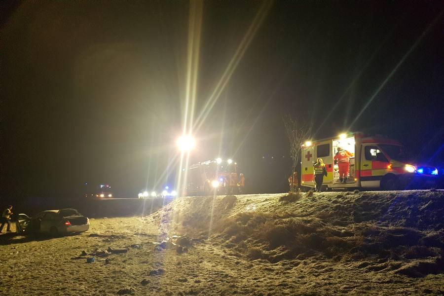 Die Integrierte Leitstelle alarmierte nach Notrufeingang durch einen hinzukommenden Passanten, welcher umgehend Erste-Hilfe leistete, gegen 6:20 Uhr die Feuerwehren Kemnath und Fortschau-Kuchenreuth, sowie den Rettungsdienst. Der Mann konnte sich mit Unterstützung des hinzukommenden Verkehrsteilnehmers selbst aus dem Fahrzeug befreien. Die Feuerwehrleute sperrten die Ortsverbindungsstraße, leuchteten die Unfallstelle aus und stellten den Brandschutz sicher.