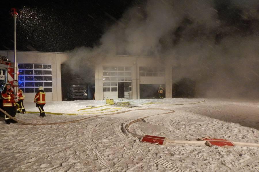 Der Brand eines Lkw-Gespannes in der Halle eines Speditionsbetriebes im Kemnather Gewerbegebiet am Samstagmorgen, 19. Januar 2019 sorgt für hohen Sachschaden. Rund 140 Rettungskräfte waren stundenlang im Einsatz.