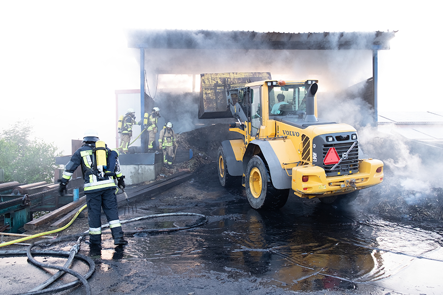 Laut Müller waren rund 25 Atemschutzgeräteträger vor Ort: "Auf Grund der Hitze war das sehr belastend für die Kameraden. Daher haben wir auch gleich eine Getränkeversorgung organisiert." Der Holzschnitzelbunker musste mit einem Radlader und später mit einem Bagger ausgeräumt werden. Die Feuerwehr löschte die Glutnester.