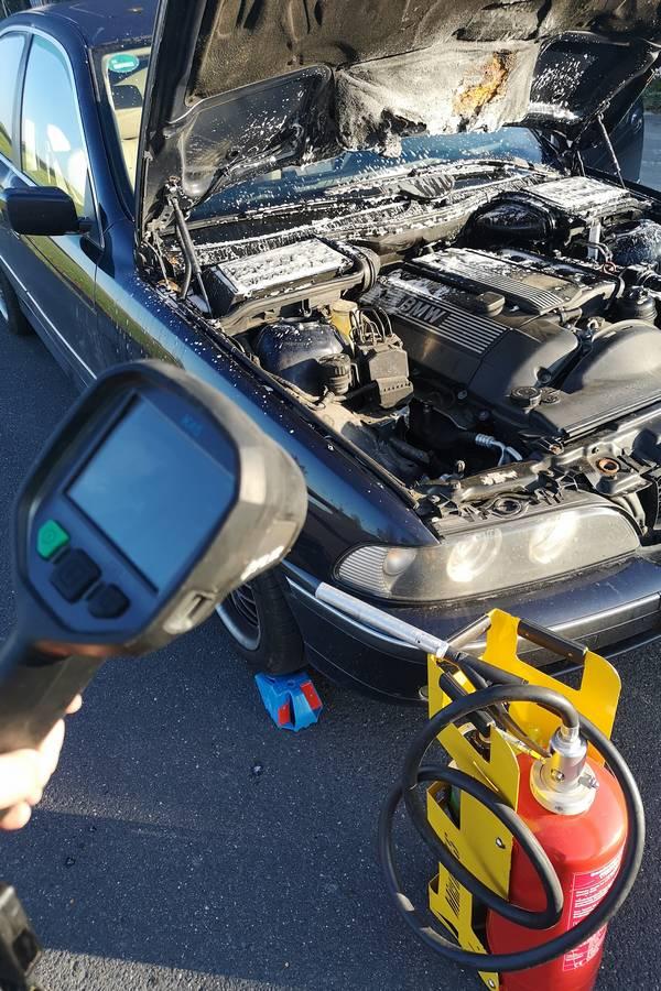 Mit einem tragbaren Kleinlöschgerät wurde der Kleinbrand im Motorraum durch die beiden Feuerwehrleute abgelöscht. Verursacht wurde der Brand wohl durch einen technischen Defekt an der elektrischen Einrichtung des Fahrzeugs. Da der beginnende Fahrzeugbrand rasch bemerkt und auch schnell abgelöscht wurde, entstand an dem 5er BMW des Kemnathers nur geringer Sachschaden durch den Brand. Zur Aufnahme des Schadens rückte eine Streife der Kemnather Polizei an.