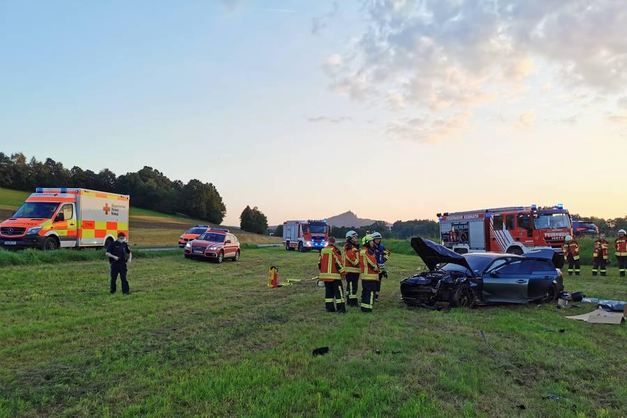 Ein Verkehrsunfall, bei dem eine Person schwer verletzt wurde, ereignete sich am Samstagabend auf der Ortsverbindungsstraße zwischen Kuchenreuth und Löschwitz bei Kemnath. In einer starken Rechtskurve geriet der 28-jährige Fahrer, welcher den Audi-Sportwagen lenkte, nach links von der Fahrbahn ab. Das Fahrzeug spießte sich im Straßengraben und überschlug sich mehrmals in der angrenzenden Wiese und kam dort auf den Rädern zum Stillstand.