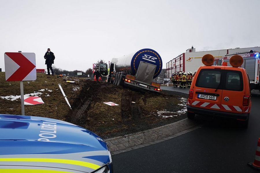 Offenbar "übersehen" hat augenscheinlich ein LKW-Fahrer den Kreisverkehr auf der Staatsstraße 2665, dem "Hegele-Kreisl" auf Höhe der Hammergrabenstraße bei Kemnath.