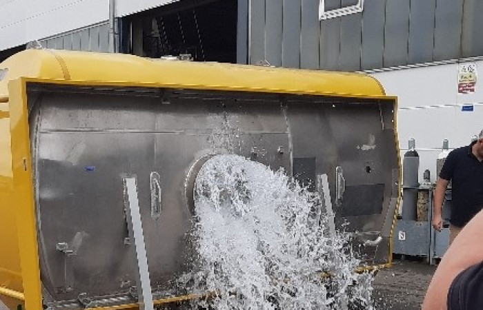 Im dritten Teil hatte man die Gelegenheit, auf dem Betriebsgelände, an einem mit Wasser befüllten und umgefallenen Tank zu üben um zu sehen, welche Kräfte im Inneren gegen den Domdeckel wirken und wie gefährlich es sein kann, den Domdeckel unsachgemäß zu öffnen.