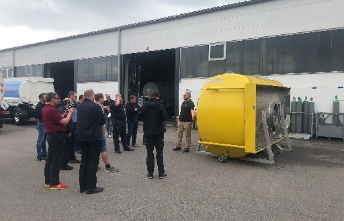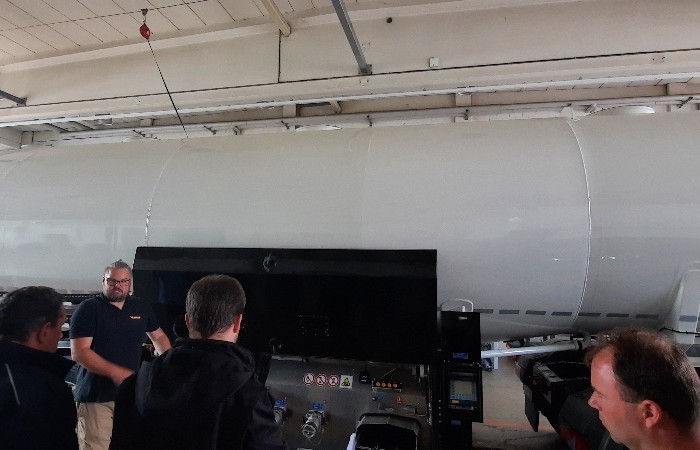 Die Fort- und Weiterbildung bestand aus drei Teilen. Einer theoretischen Einführung in die Tankwagentechnik, einer Führung durch den Betrieb, mit Erläuterung der einzelnen Montageplätzen, vom Anliefern der Tankrohlinge bis hin zur Endfertigung und einem praktischen Teil an einem Havarie-Modell.
