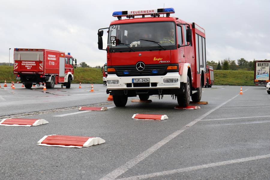 Mit dem Führerschein allein darf man deshalb noch nicht ans Steuer. In den Feuerwehren braucht man zusätzlichen den Lehrgang zum Maschinisten, denn der Fahrer ist zugleich der Mann an der Pumpe oder die Frau am Stromerzeuger. Und zusätzlich ist man noch für das Wohlbefinden der bis zu acht weiteren Kameraden im Fahrzeug sowie die weiteren, zivilen Verkehrsteilnehmer verantwortlich. Da muss man "sein" Fahrzeug kennen, wissen wie es sich auf verschiedenen Untergründen oder nasser, rutschiger Fahrbahn verhält, wie man richtig reagiert.