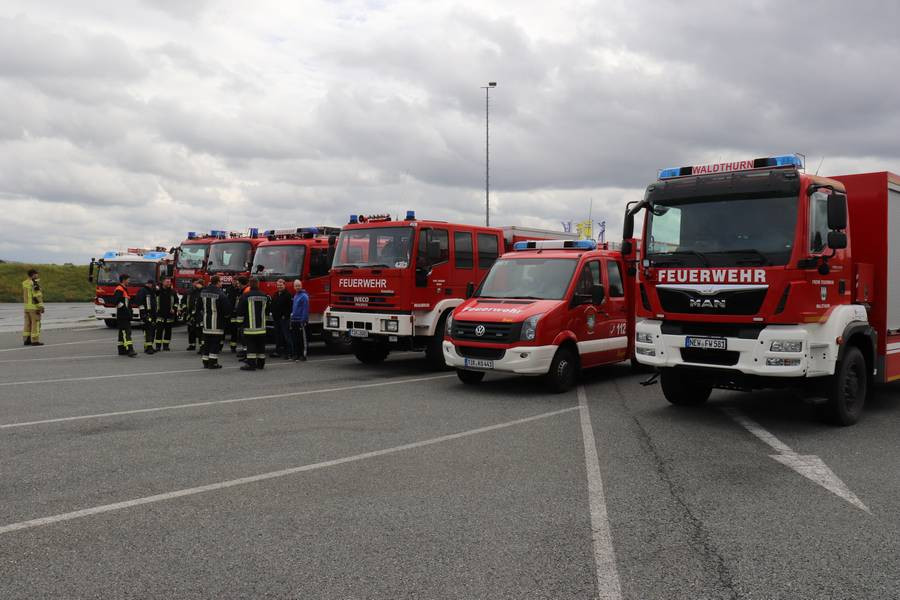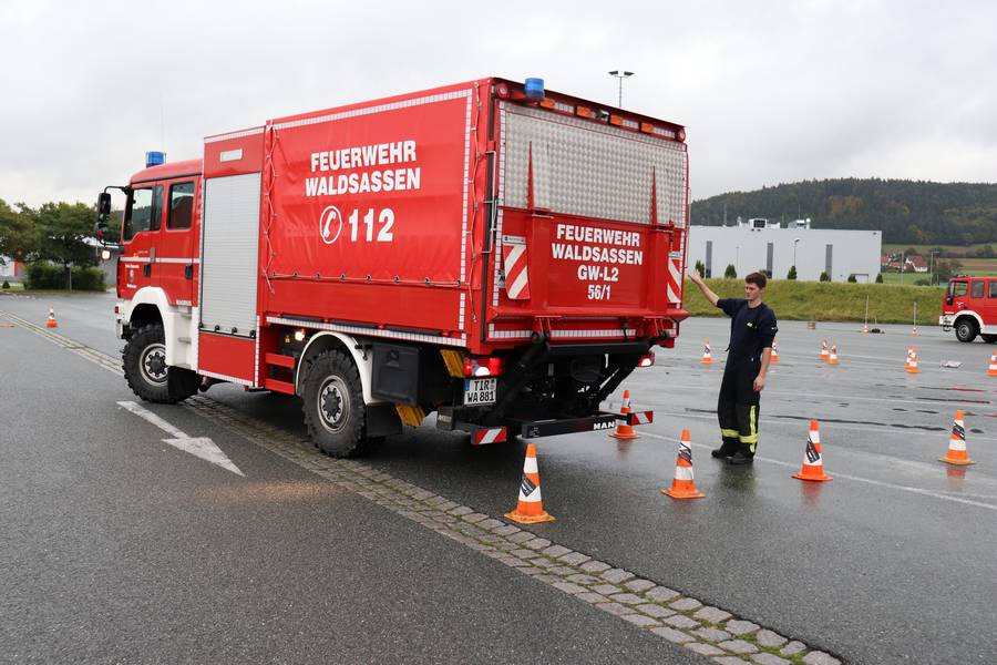 Und das lernt man nicht in der normalen Fahrschule. Dafür gibt es Fahrsicherheitstrainings, so wie vor kurzem in Himmelkron am Parkplatz des Fichtelgebirgshof. 18 Kameraden der Feuerwehren Bärnau, Kondrau, Speinshart, Tirschenreuth, Waldsassen, Waldthurn und Windischeschenbach bekamen hier die Möglichkeit unter den wachsamen Augen des Ausbilders Matthias Zeilmann der Fahrschule Zeilman AVUS aus Ahorntal ihr Können unter Beweis zu stellen und ihre Fahrpraxis zu verbessern. Alles auf abgesperrter Fläche. Möglich machte dieses Training der Landesfeuerwehrverband Bayern in Kooperation mit der Kommunalen Unfallversicherung Bayern (KUVB). Die Gefahrenbremsungen, das Rangieren in beengtem Raum oder eine schnelle Kehrtwende auf begrenzter Fläche war der eine Teil der praktischen Ausbildung. Aber auch der Beifahrer wurde dabei gefordert, denn er musste den Fahrer einweisen. Und um diese Übungen zu erschweren, gleich das ganze nochmal ohne die Seitenspiegel, ohne Rückfahrkamera. Nur durch die Augen des Beifahrers und seine Kommandos.