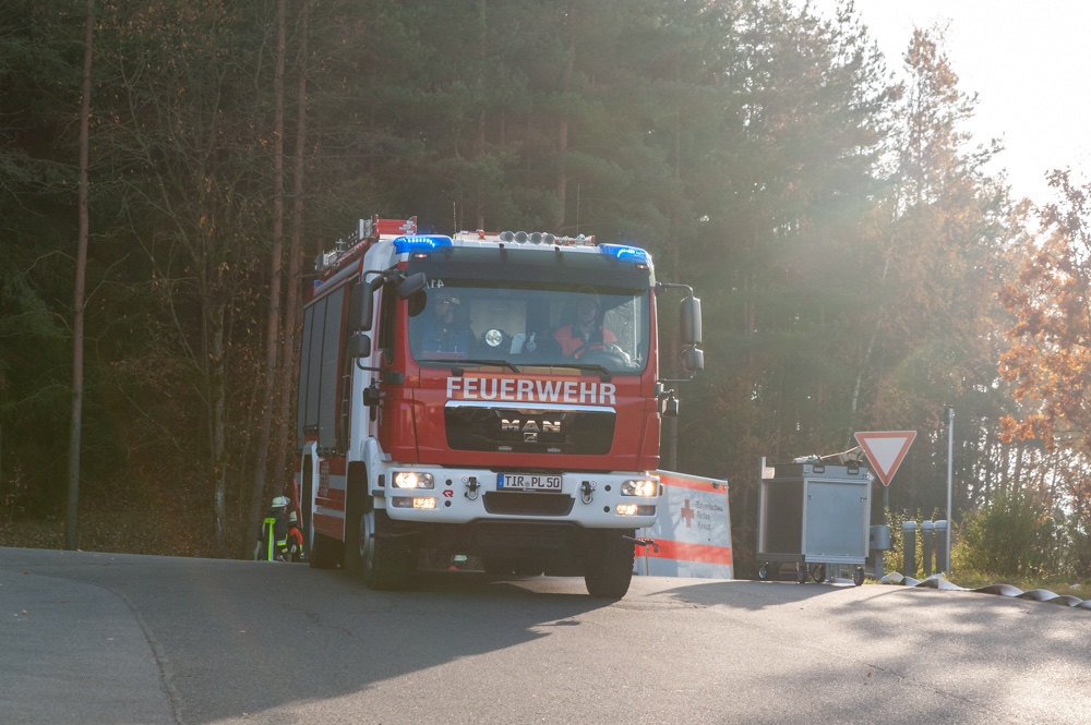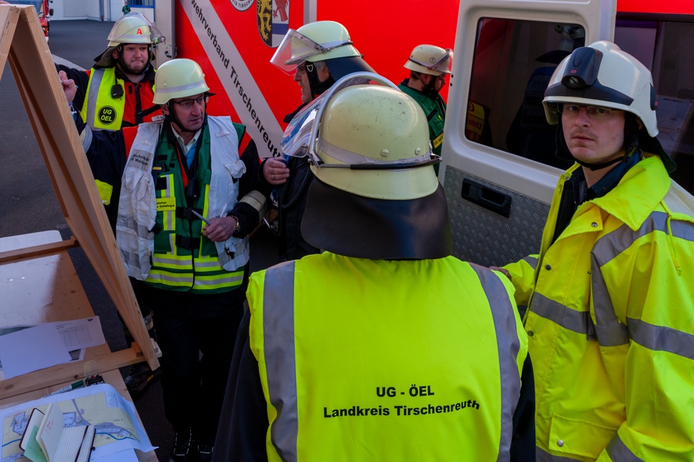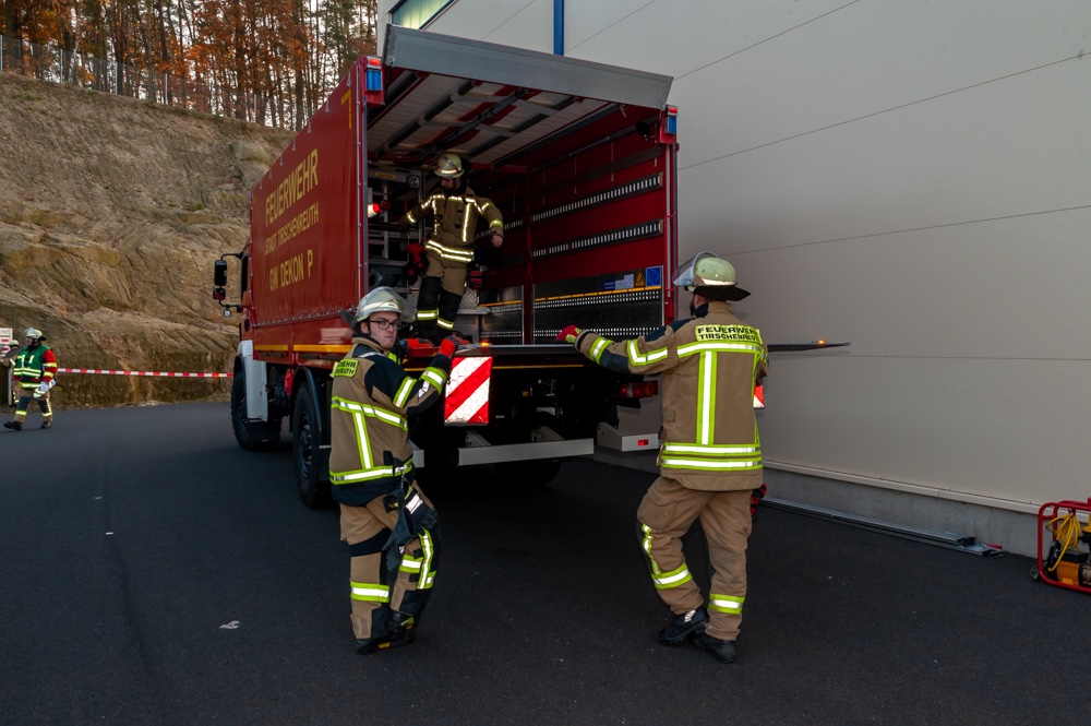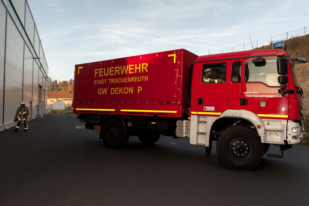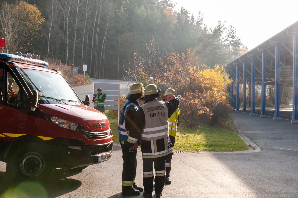 Das nun folgende Einsatzszenario stellte das Umfangreichste der gesamten Übung dar. Die Feuerwehren Tirschenreuth, Mitterteich, Waldsassen und Wiesau fuhren die etwa 500 Meter entfernt gelegene Einsatzstelle im hinteren Bereich des Betriebsgeländes an.