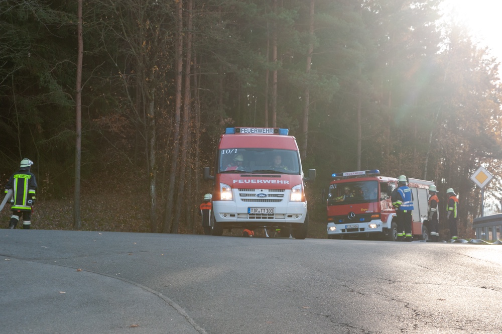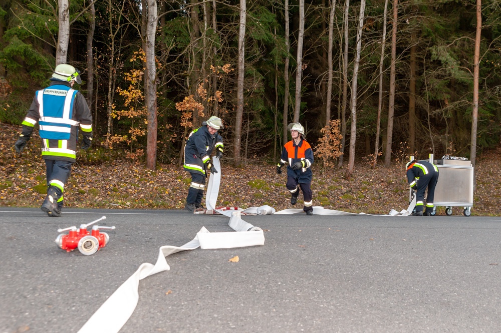Als zusätzliche Schwierigkeit wurde zudem ein kleinerer Waldbrand angenommen, der bekämpft werden musste. Hierzu wurde eine etwa 400m lange Schlauchstrecke über die Zufahrtsstraße in Richtung eines an die Firma angrenzenden Waldstücks gelegt und mit einer Wasserabgabe von 1.200 l pro Minute der entstehende Waldbrand abgelöscht. Die Abschnittsleitung für beide Einsatzstellen übernahm KBM Helmut Czepa.
