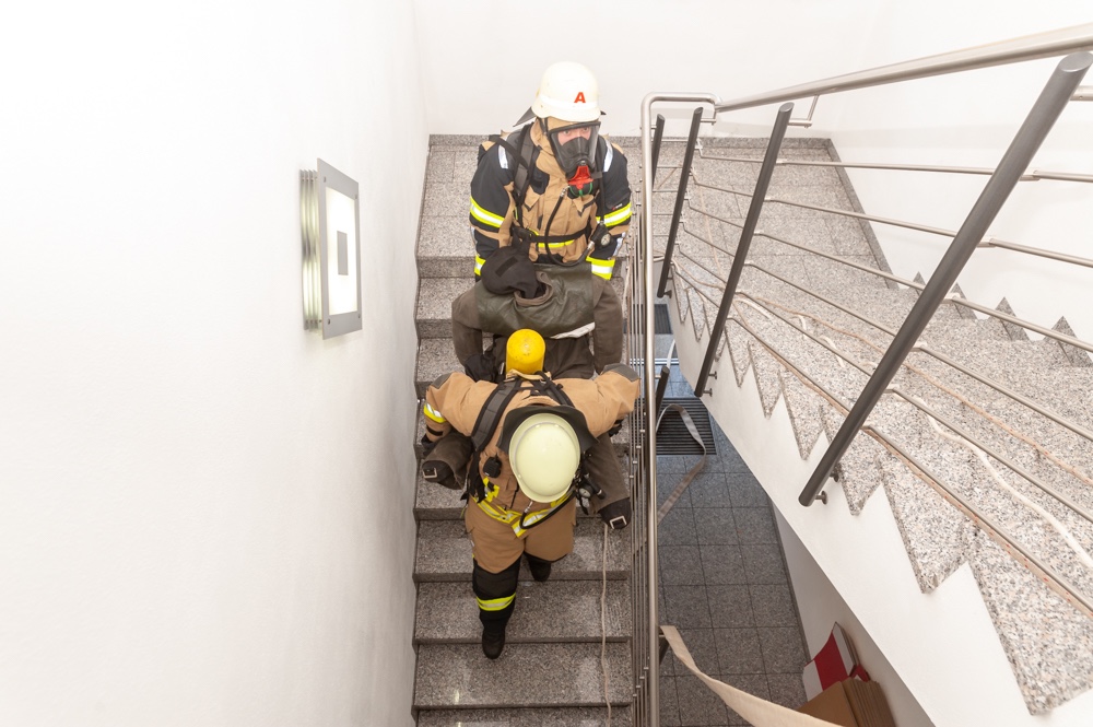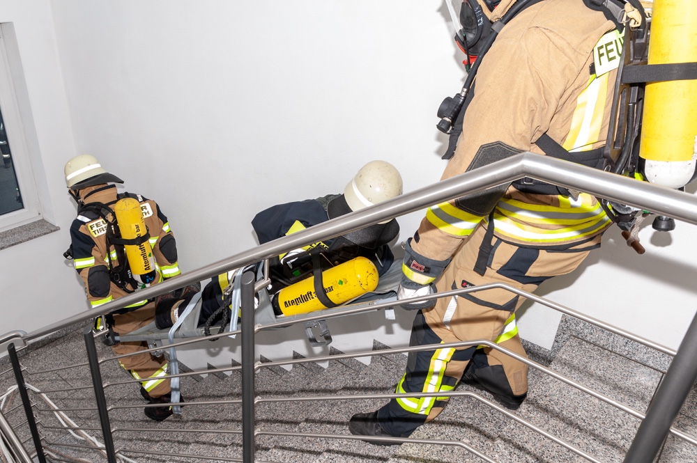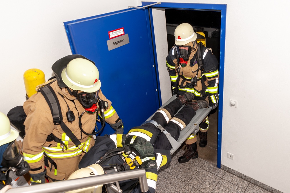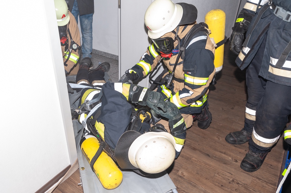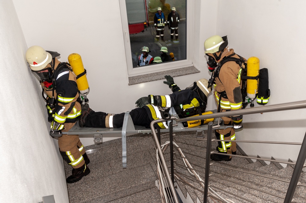Auch zwei Atemschutz-Geräteträger mussten von ihren Kollegen mit Hilfe von Rettungstragen gerettet werden, nachdem diese einen Notruf, ein so genanntes „Mayday-ATS in Not“, gesendet hatten. Die Leitung für diesen Abschnitt lag bei KBM Roland Frank.