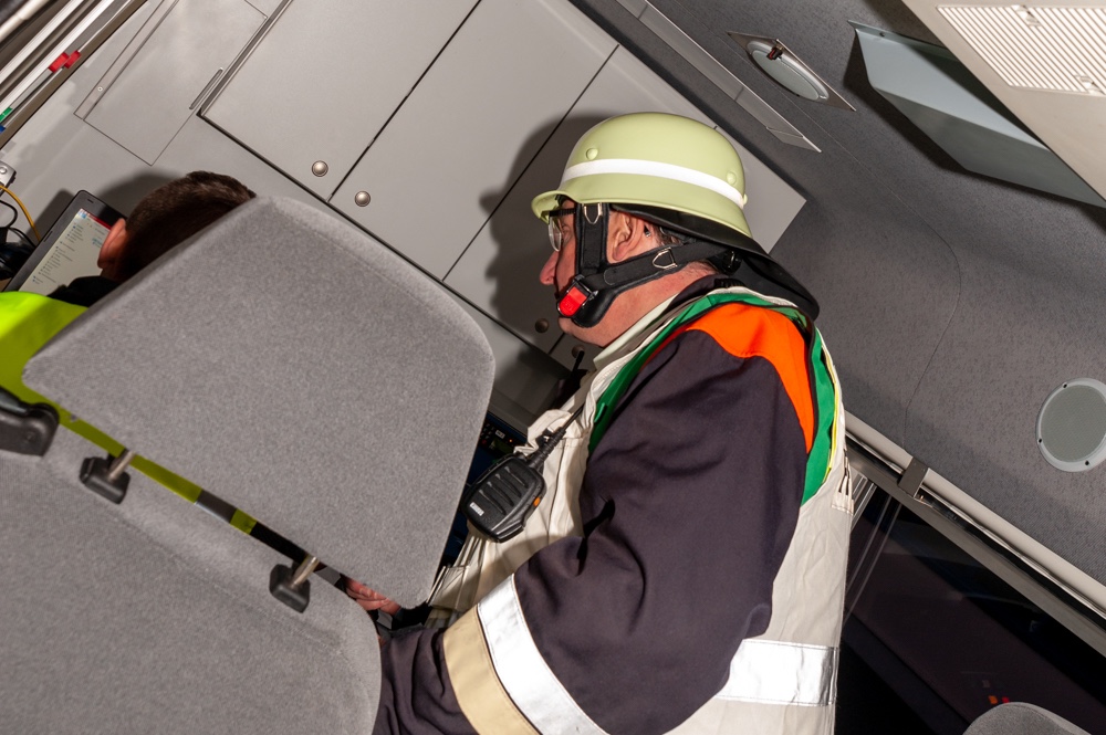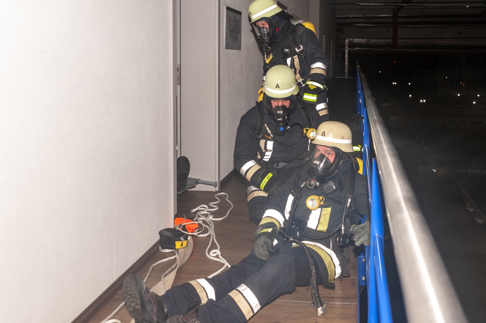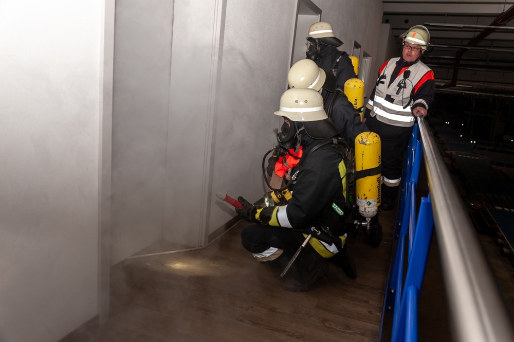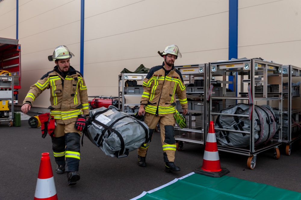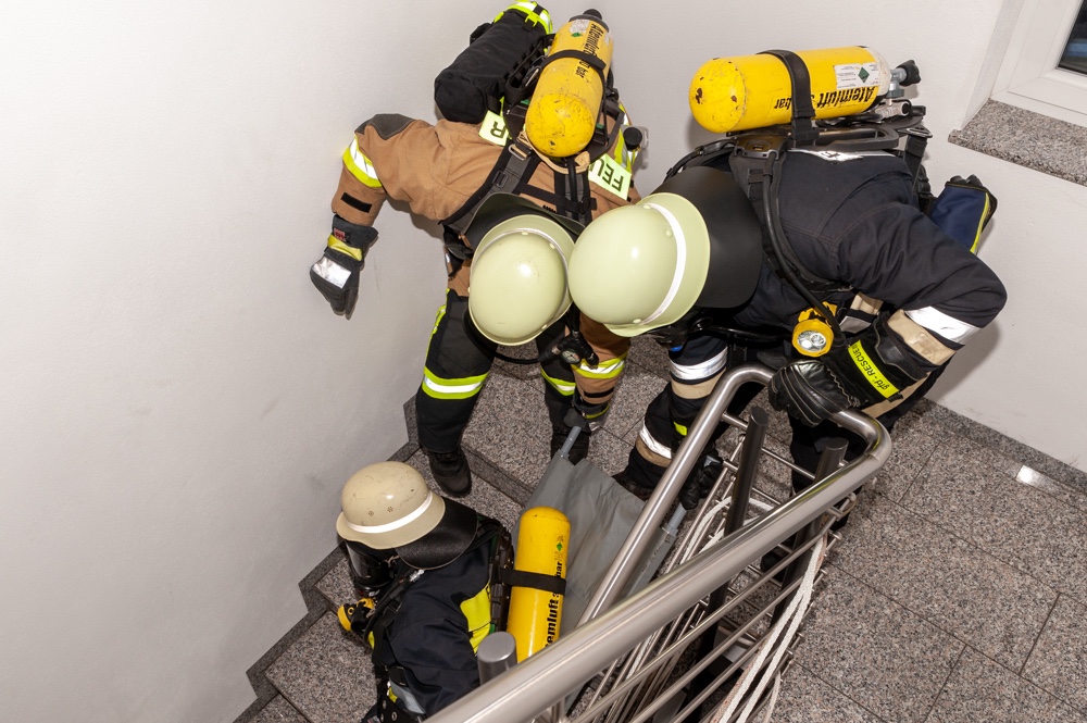 Auch zwei Atemschutz-Geräteträger mussten von ihren Kollegen mit Hilfe von Rettungstragen gerettet werden, nachdem diese einen Notruf, ein so genanntes „Mayday-ATS in Not“, gesendet hatten. Die Leitung für diesen Abschnitt lag bei KBM Roland Frank.