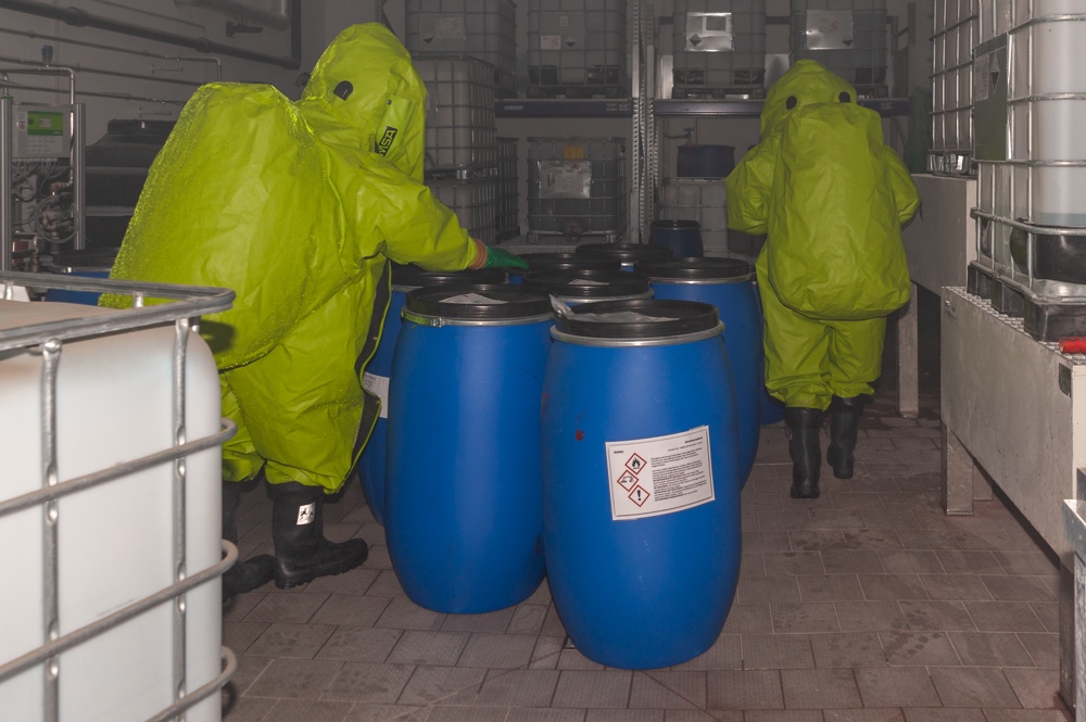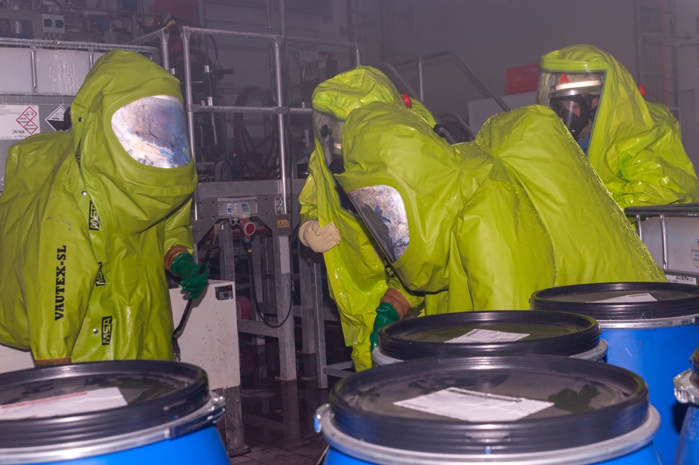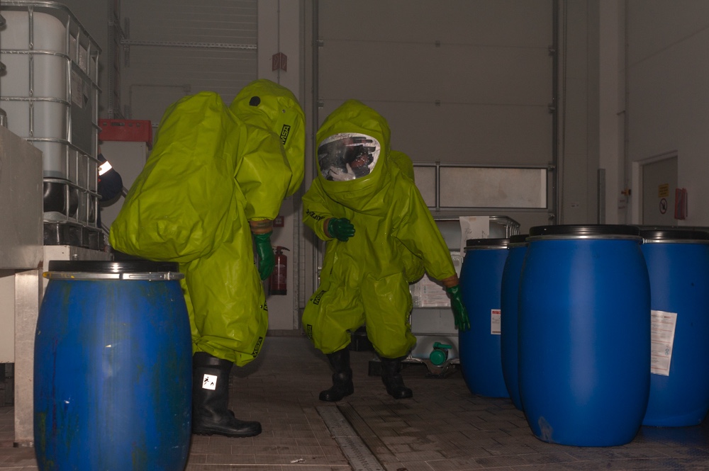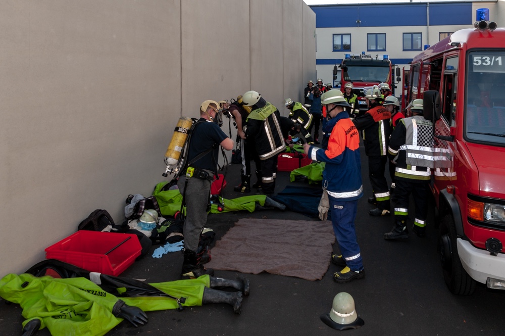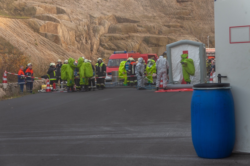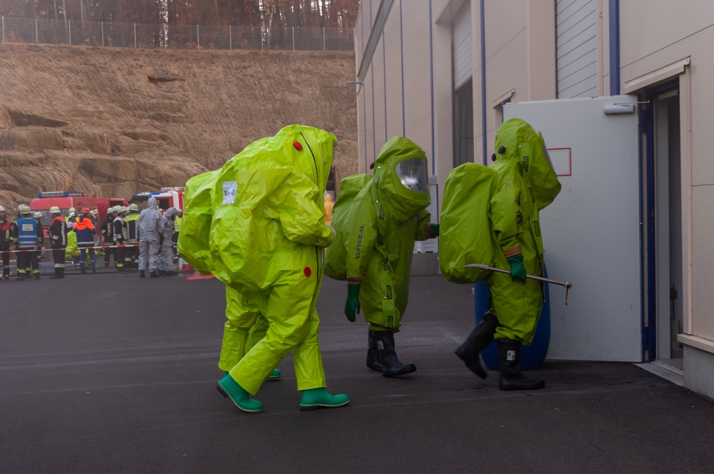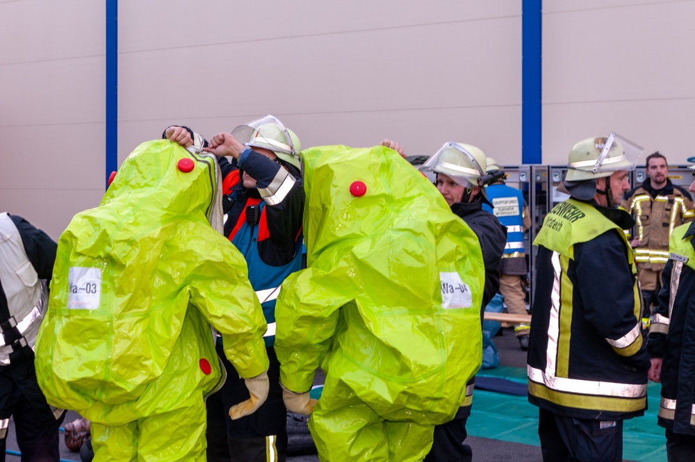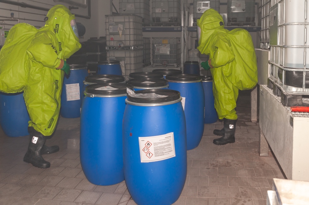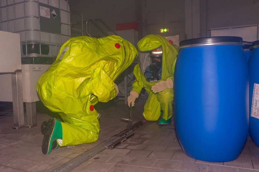 „Unfall im Gefahrgutlager, mehrere Fässer verschiedener Substanzen eingestürzt und laufen aus, Brand im Palettenlager“
