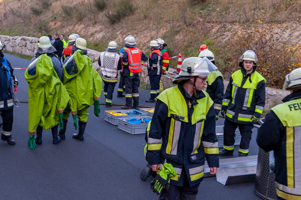 Angenommen wurde ein Entstehungsbrand an einem Sattelschlepper im überdachten und zur Seite hin offenen LKW-Verladebereich. Die örtlich zuständige Feuerwehr Liebenstein baute als erste Maßnahme eine Wasserversorgung auf und nahm ein erstes Schaumrohr vor.