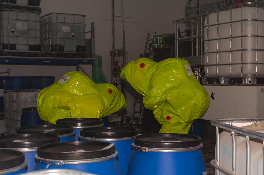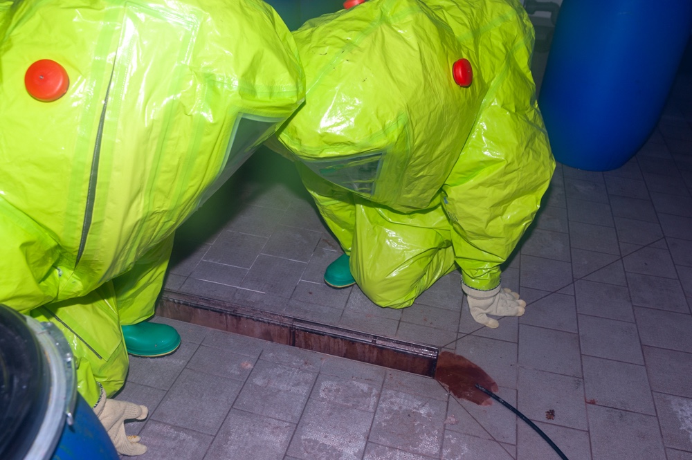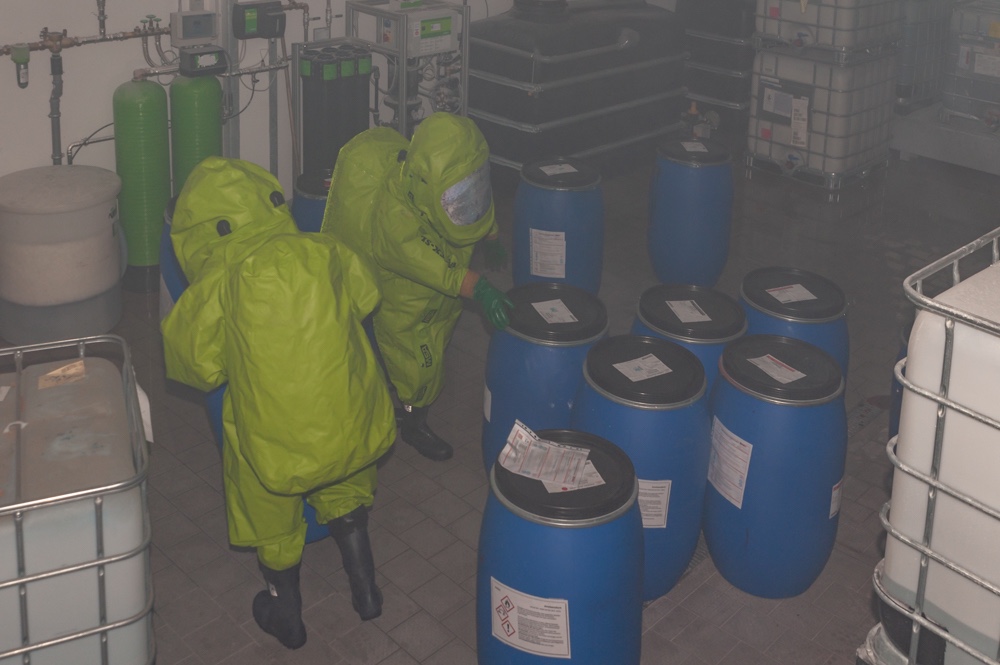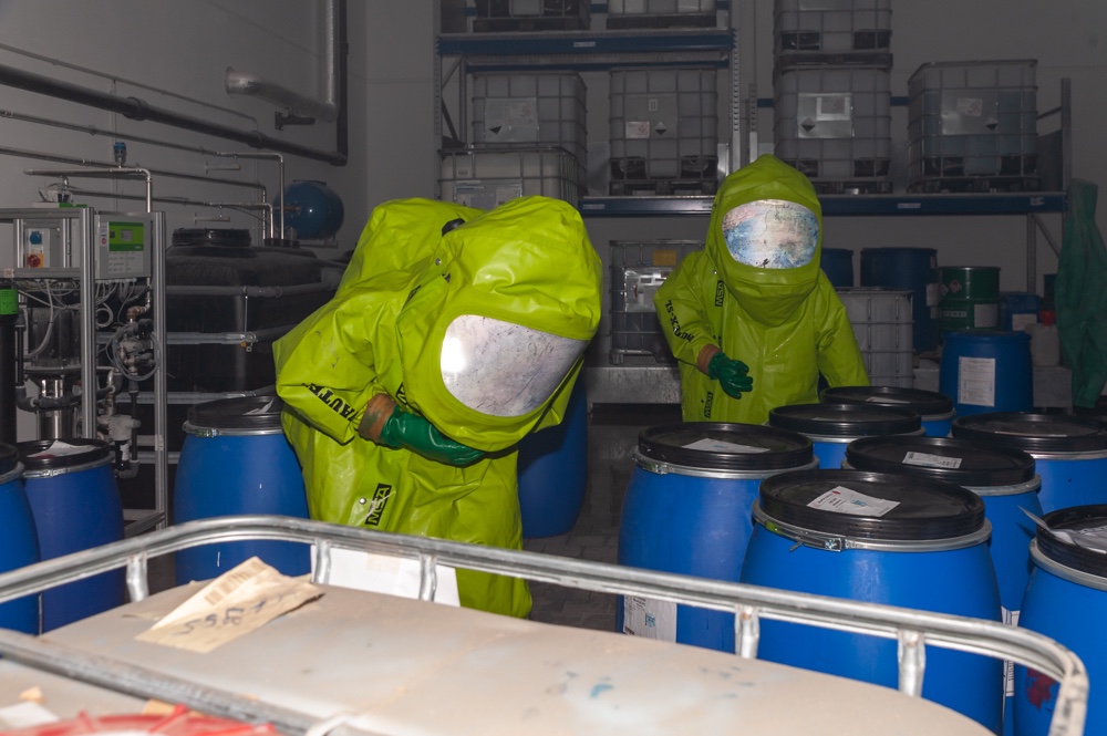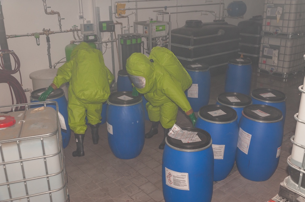 Im Verlauf des Einsatzes wurden die verschiedenen austretenden Gefahrstoffe und die evtl. möglichen Reaktionen untereinander festgestellt, Leckagen an undichten Gefahrstoff-Gebinden abgedichtet und zwei Personen aus dem Gefahrenbereich gerettet.
