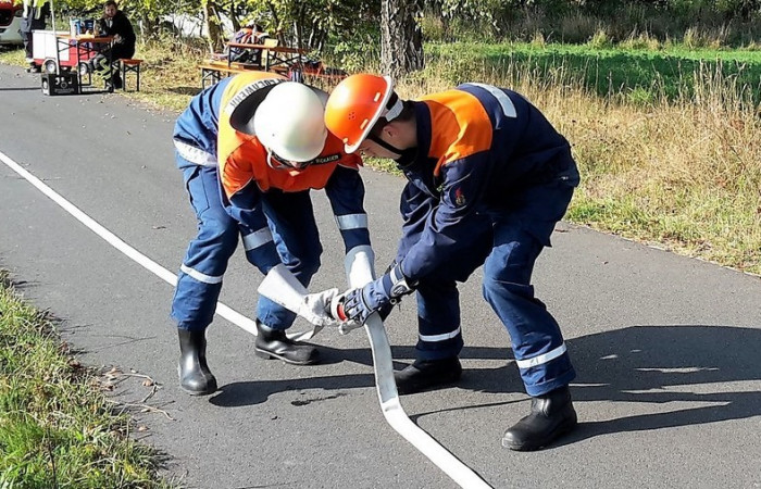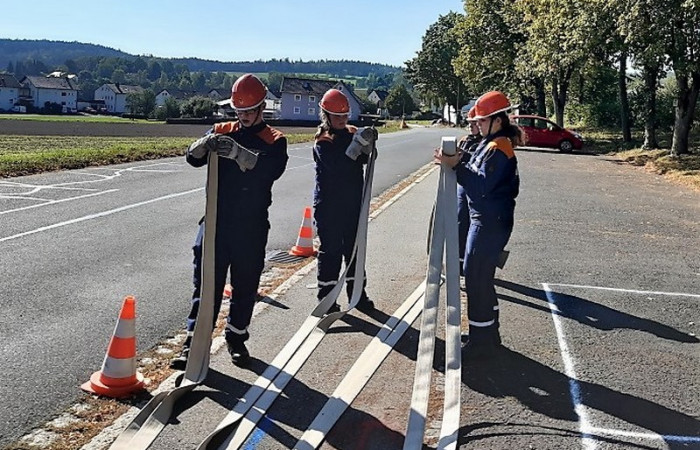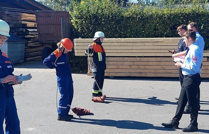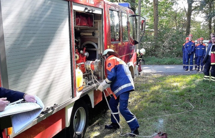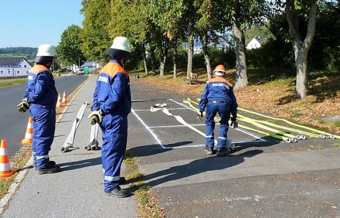 Bei der Prüfung wurde besonders auf die Arbeit im Trupp bzw. in der Gruppe geachtet. Bei Stationen wie dem Zielspritzen mit der Kübelspritze oder dem Zusammenkuppeln einer 90-Meter-Schlauchstrecke konnten die Jugendlichen dies unter Beweis stellen. Aber auch die Leistung des Einzelnen wurde bei Übungen wie dem Brustbund, dem Ausrollen eines C-Schlauches oder dem Anlegen eines Mastwurfes gefordert. Insgesamt mussten so fünf Trupp-, fünf Einzelübungen und eine Theorieprüfung absolviert werden. Kreisjugendwart Wolfgang Bauer konnte allen Jugendlichen zur bestandenen Jugendleistungsprüfung gratulieren und bedankte sich bei den Jugendwarten und Helfern für die Ausbildung.