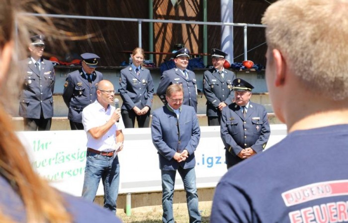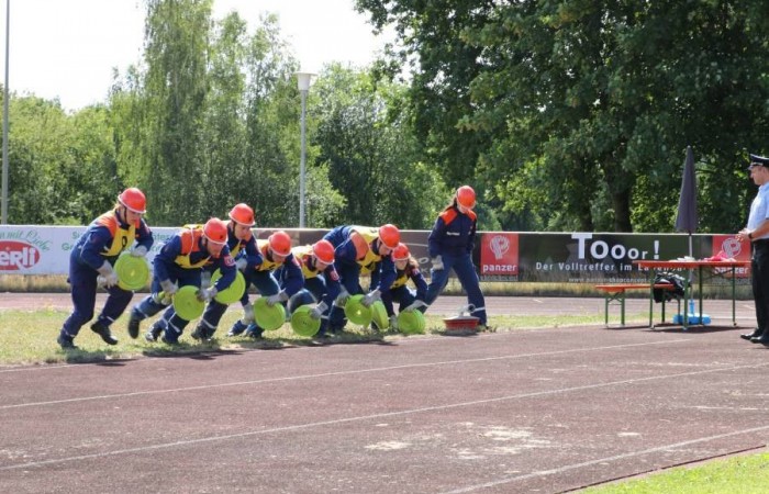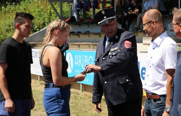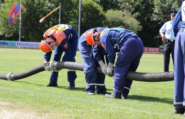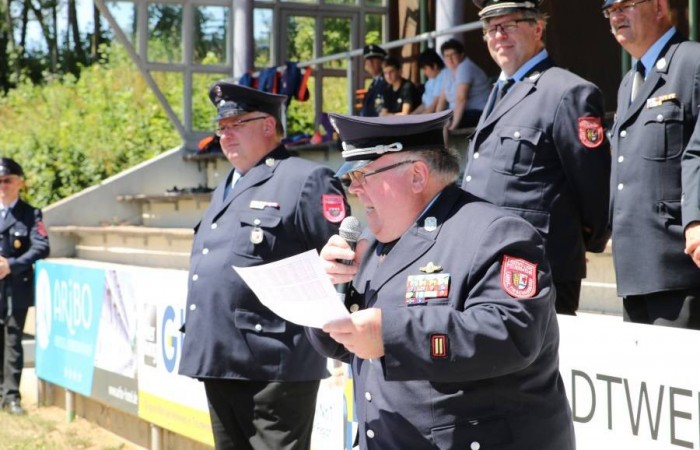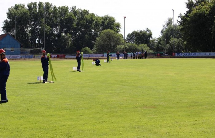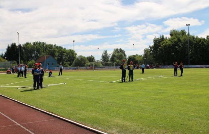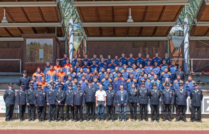 Erbendorf. (njn) Großaufgebot der Feuerwehr im Sportzentrum am Kreinzl. Exakt 48 Bewerber aus sieben Jugendgruppen aus dem gesamten Landkreis absolvierten im Sportzentrum Kreinzl die Deutsche Jugendspange. Bei perfektem Sommerwetter zogen die Jugendfeuerwehrler sowie die Führungskräfte des Landkreises an der Tribüne vorbei auf das Sportgelände ein. Die Organisation hatten Ausbildungsleiter Dieter Höfer und der Abnahmeberechtigte der Deutschen Jugendfeuerwehr, Armin Jehl aus Bruck, in der Oberpfalz, übernommen. Den Prüfungsanforderungen stellten sich Teilnehmer aus Mitterteich, Konnersreuth/Neudorf-Rosenbühl/Kondrau, Beidl/Schönficht, Kemnath/Kötzersdorf, Kastl sowie zwei Gruppen aus Tirschenreuth. Vor den Schiedsrichtern bewiesen sie zuerst ihr Wissen, dann konnten sie in der Praxis um die Punkte kämpfen. Dabei war allerdings Teamgeist gefragt. Das galt beim Löschaufbau ebenso, wie beim Staffellauf und beim Schlauchkuppeln. Der stellvertretende Kreisjugendwart stellte fest, dass sich das Üben in den letzten Wochen gelohnt habe. In die gleiche Kerbe schlug Kreisbrandrat Andreas Wührl. Den zeitlichen Einsatz Feuerwehrjugend hob stellvertretender Landrat Dr. Alfred Scheidler hervor. Auch Bürgermeister Hans Donko lobte das Engagement. Schließlich überreichte der Abnahmeberechtigte Armin Jehl aus dem Landkreis Schwandorf zusammen mit dem Stv. Landrat Dr. Alfred Scheidler, dem Bürgermeister und Kreisbrandrat Andreas Wührl die Abzeichen.