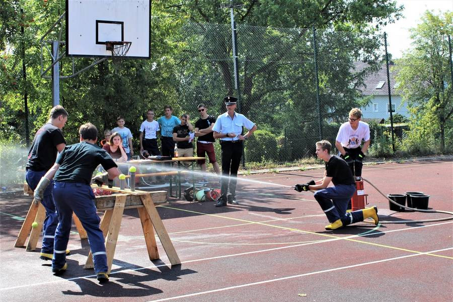 In den Mittelpunkt stellte Kreisjugendwart Wolfgang Bauer aus Krummennaab die zum Wettbewerb angetretenen Anwärter aus den Feuerwehren Fuhrmannsreuth, Ahornberg, Falkenberg, Griesbach, Hohenthan, Krummennaab, Löschwitz/Kaibitz, Waldeck, Erbendorf, Friedenfels, Kulmain/Lenau und den beiden Teams aus Thumsenreuth. Acht Disziplinen mit verschiedenen Geschicklichkeitsspielen mussten sie meistern. Nicht die Perfektion beim Kistenlauf, beim Abspritzen von Tennisbällen, Schubkarrenlauf, Schwammwerfen, bei der Ballstafette, Hula-Hup-Reifen durchsteigen, Ski-Bretterlauf oder beim Regenschirme werfen waren gefragt, sondern Abwechslung.