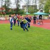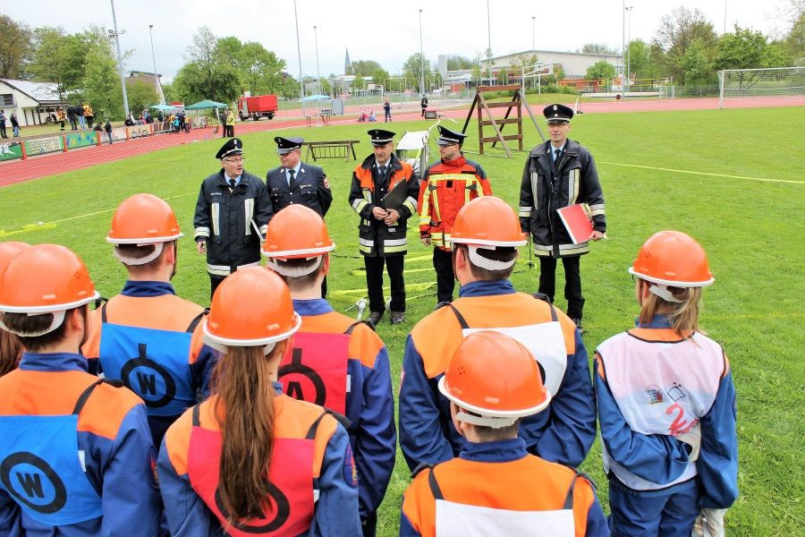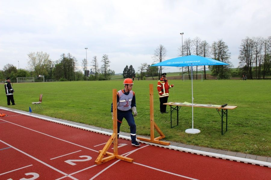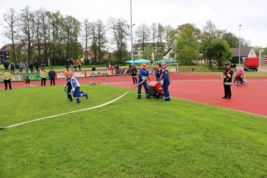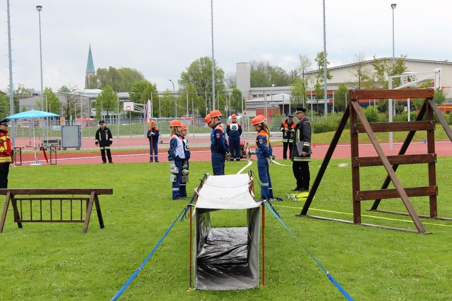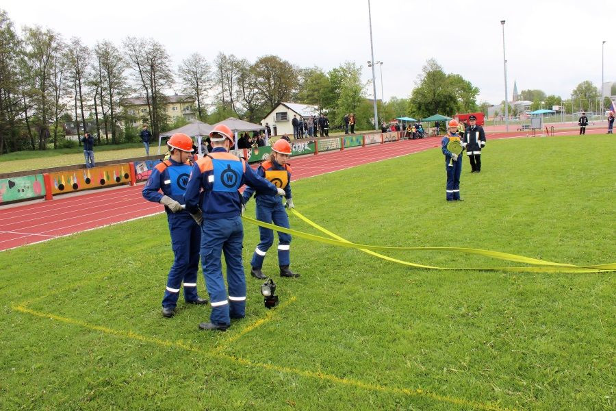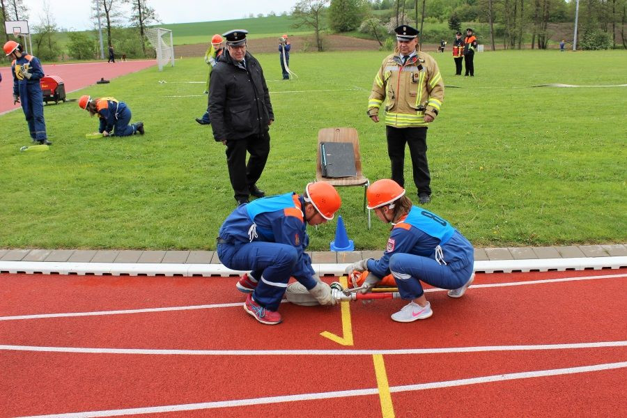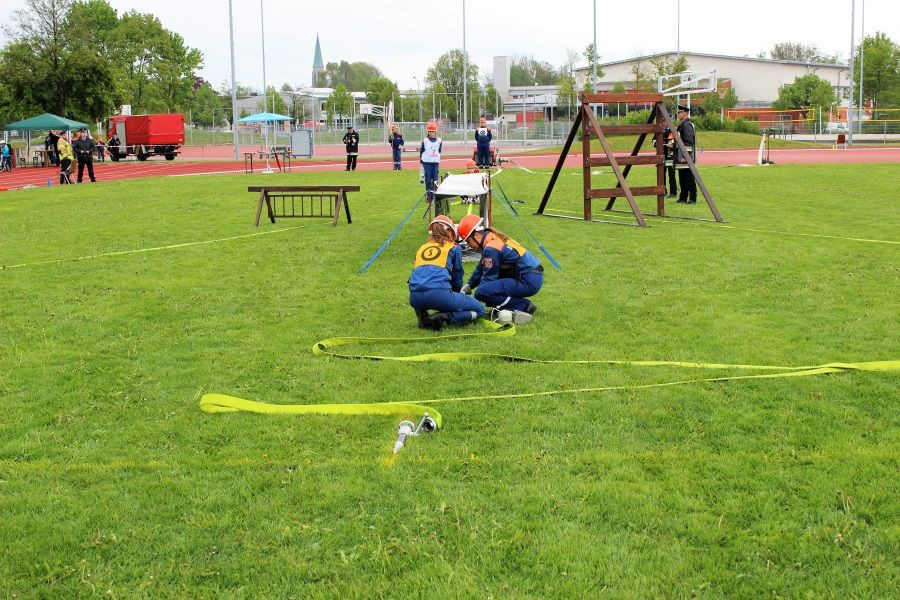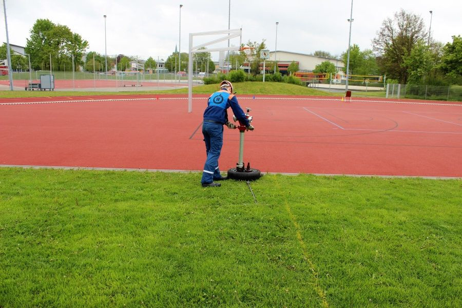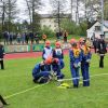 So galt es, einen 15 Meter langen C-Druckschlauch auf der Tartan-Bahn zusammenzurollen, ein Laufbrett zu überlaufen, Schutzausrüstung nach dem Aufstehen von einer Krankentrage anzulegen, sowie ein Strahlrohr an einen Schlauch anzukuppeln und einen „Mastwurf mit Halbschlag“ daran anzulegen. Auch hier wurde durch die Wertungs- und Schiedsrichter den Jugendfeuerwehranwärterinnen und -anwärtern genauestens „auf die Finger geschaut“, die möglichen Fehler dokumentiert, die Zeit gestoppt und entsprechend in die Gesamtwertung eingerechnet.