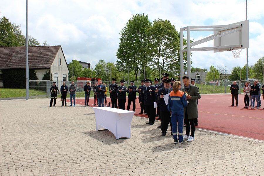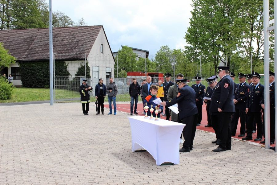 Kreisbrandmeister und Abnahmeberechtigter Dieter Höfer vollzog die Siegerehrung und gab die Wettbewerbsgesamtauswertung bekannt. Die Jugendfeuerwehr Tirschenreuth ergatterte mit 1427 Punkten den ersten Platz, gefolgt von der Jugendfeuerwehr Thanhausen mit 1403 Punkten. Den dritten Platz belegte die Jugendfeuerwehr Mitterteich mit 1390 Punkten. 1369,9 Punkte erreichte die Gruppe der Jugendfeuerwehren Atzmannsberg-Löschwitz mit 1369,9 Punkten und landete damit auf Platz vier. Neben den entsprechenden Bescheinigungen und dem Vermerk im Dienstbuch, so gab es auch Pokale.
