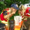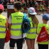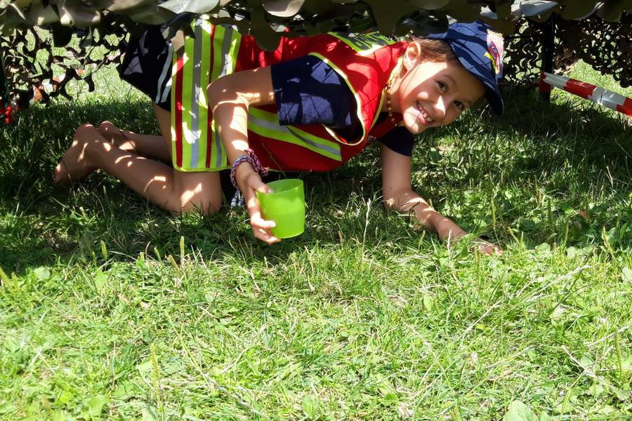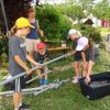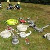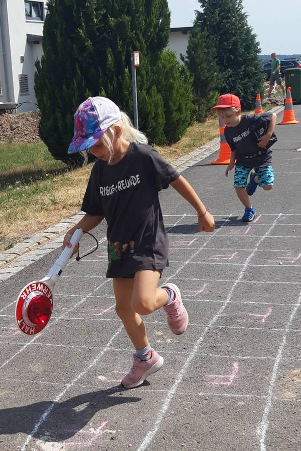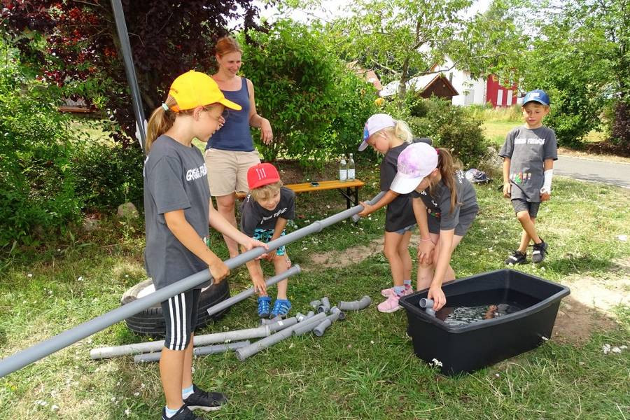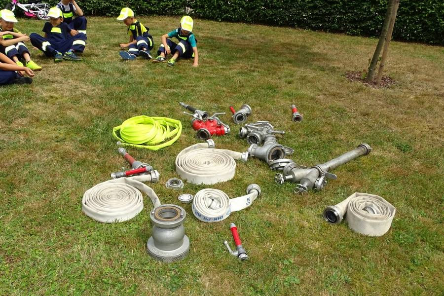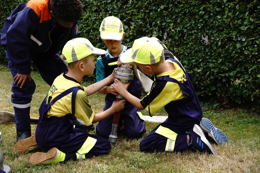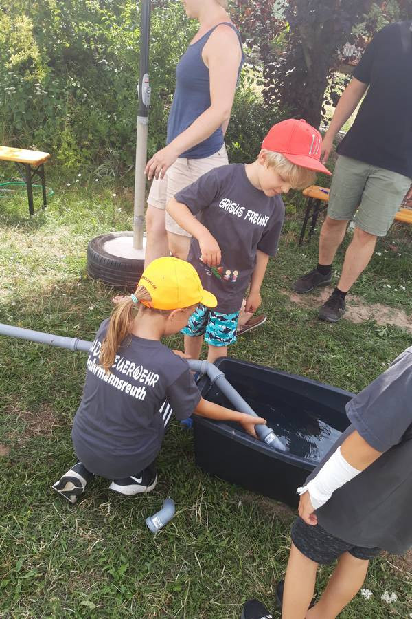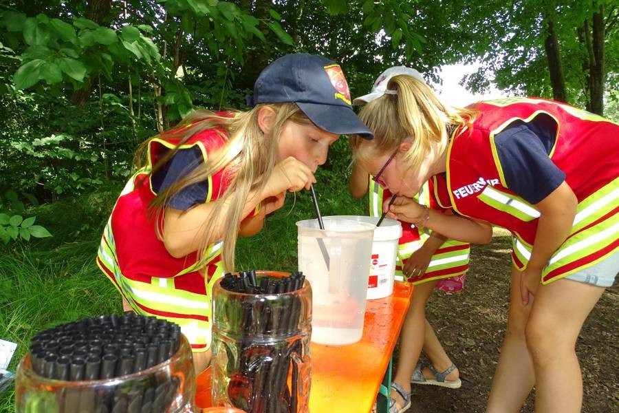 Die Gruppen gingen an ihre Start-Stationen und begannen nach dem Startschuss (bei uns natürlich dem Start-Martinshorn). Wie bei der aktiven Wehr stand auch bei den 14 Stationen der Teamgeist im Vordergrund. Gemeinsam musste z.B. Wasser mittels eines Strohhalms transportiert, eine Rohrleitung gebaut oder Wasser durch einen Hindernisparcours getragen werden. Bei der Station "Atemschutz" war der Tastsinn gefragt, an anderer Stelle musste ein Notruf abgesetzt oder die stabile Seitenlage geübt werden. Bei der Station "Was brennt wie" wurde die Explosion einer leeren Sprühdose gezeigt, bei "Hochwasser-Einsatz" mussten Sandsäcke zielgenau geworfen werden.