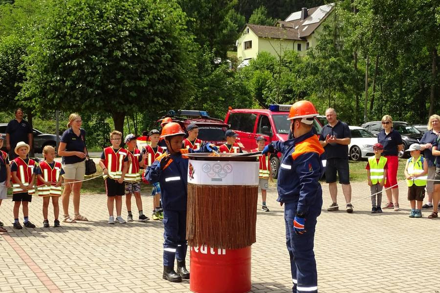 Bei der Feuerwehr sind alle gleich wichtig und arbeiten zusammen, egal ob Kinderfeuerwehrler, Kommandant oder Kreisbrandinspektor. Dies wurde dadurch symbolisiert, dass man sich im Kreis aufstellte und an einer Leine festhielt. Mitten im Kreis stand, wie es sich für eine Olympiade gehört, das olympische Feuer. Dieses entzündeten Tyrek und Nils, zwei ehemalige Feuerdrachen.