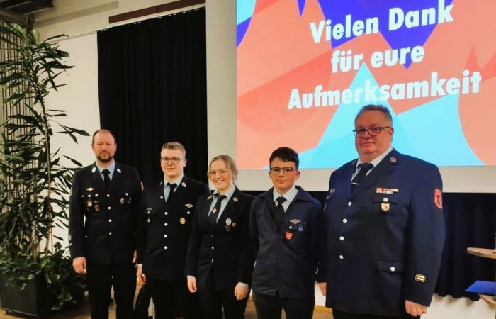 Mit der Ehrennadel in Silber der Jugendfeuerwehr Bayern wurden Theresa Frank, Carina Hart und Dominik Kugler für die Verdienste in ihren Jugendfeuerwehren geehrt. Zwei weitere Ehrungen werden zu gegebener Zeit nachgeholt.