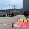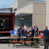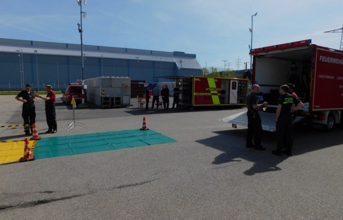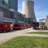 Nach einer Werksrundfahrt mit Informationen zu den einzelnen Bereichen des Kraftwerks und Gruppenbild vor dem Kühlturm startete der praktische Teil. Vor einer Halle, in der radioaktive Abfälle gelagert werden, bauten die teilnehmenden Feuerwehren ihre Gerätschaften auf; somit konnten sämtliche Geräte besichtigt werden, darunter auch Sonderfahrzeuge wie der ABC-Erkunder des Landkreises Cham und der Abrollbehälter Atemschutz/Strahlenschutz der Feuerwehr Amberg.