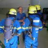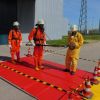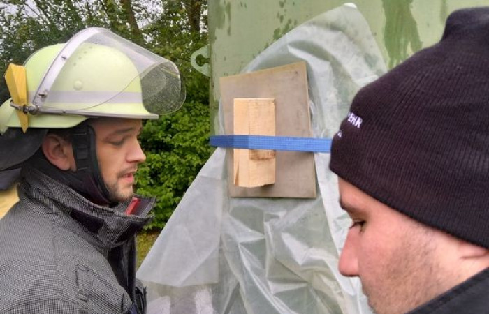 Prinzipiell sollen die Lehrgangsteilnehmer darauf trainiert werden, um diese Abdichtungen im Chemikalienschutzanzug (CSA) vorzunehmen, denn als Einsatzszenario wurde der Austritt von Laugen oder Säuren angenommen. Doch um die verschiedenen Materialien und Vorgehensweisen einzuüben, wurde lediglich im einfachen Schutzanzug geübt – und bereits hier stellte sich schnell heraus, dass es auch ohne CSA teilweise sehr schwierig ist, die einzelnen Bauteile zum Absichten zusammenzuschrauben. Was an der Übungsanlage relativ schnell behoben werden konnte, wird im Ernstfall unter CSA deutlich mehr Zeit in Anspruch nehmen. Dies gilt für die Einsatzleiter bzw. Gruppenführer zu beachten, damit ein rechtzeitiger Austausch des Angriffstrupps in die Wege geleitet werden kann.