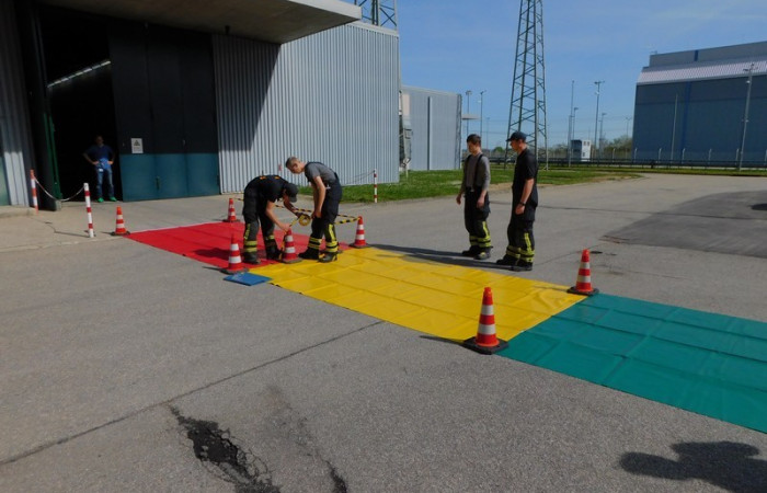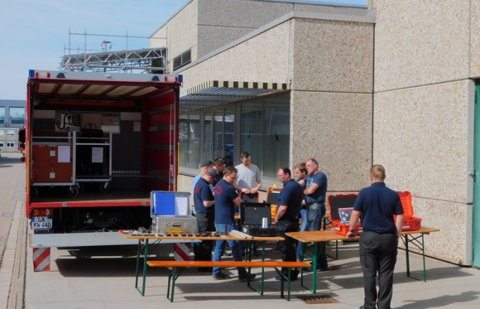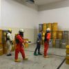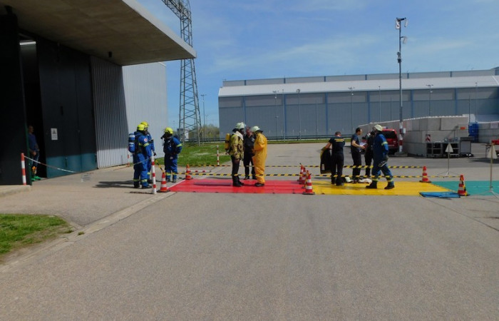 Als der Kontaminationsnachweisplatz betriebsbereit war, konnten die Trupps unter Anleitung der Werkfeuerwehr in die Halle vorrücken und bekamen praktische Tipps zum Vorgehen an sich und zum Umgang mit den Messgeräten, insbesondere dem Teledektor. Die Vorbereitung der Übung seitens der Werkfeuerwehr war derart ausgeklügelt, dass die Kameraden zwar höhere Werte als beim Einsatz eines Prüfstrahlers messen konnten, in der persönlichen Dosis aber dennoch weit unter den Grenzwerten für Übungseinsätze der Feuerwehrdienstvorschrift FwDV 500 blieben - das Abstandsgesetz wurde für die Teilnehmer vom theoretischen Wissen zur praktischen Erfahrung.