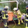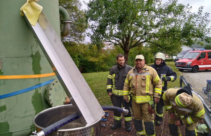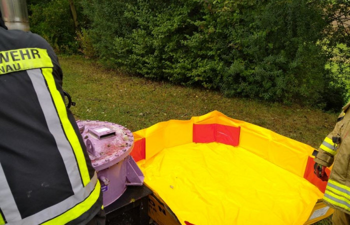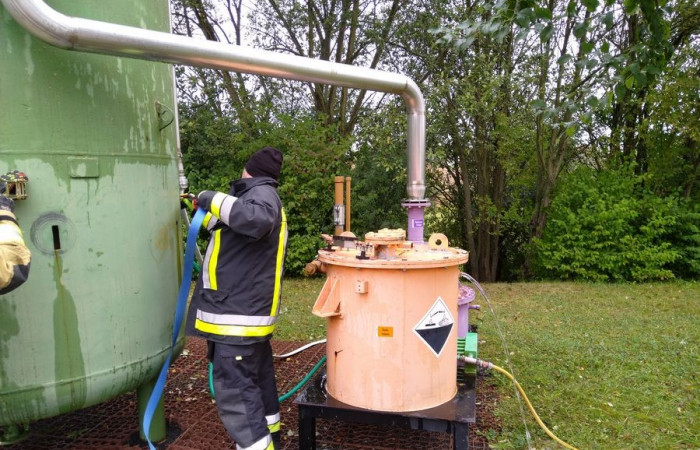 Das gilt auch für das Auffangen und/oder Umfüllen von Flüssigkeiten im Einsatz. Wie in vielen Bereichen von Feuerwehreinsätzen ist auch im Gefahrguteinsatz Kreativität gefragt. Beispielsweise hatten Übungsteilnehmer eine in großer Höhe austretende Flüssigkeit über eine Edelstahlrinne in ein Edelstahlfass umgeleitet, so dass die Flüssigkeit nicht in den Boden gelangen konnte. Denn nicht immer ist Abdichten möglich oder nimmt deutlich mehr zeit in Anspruch, so dass die Ausbreitung zunächst anderweitig verhindert werden sollte.